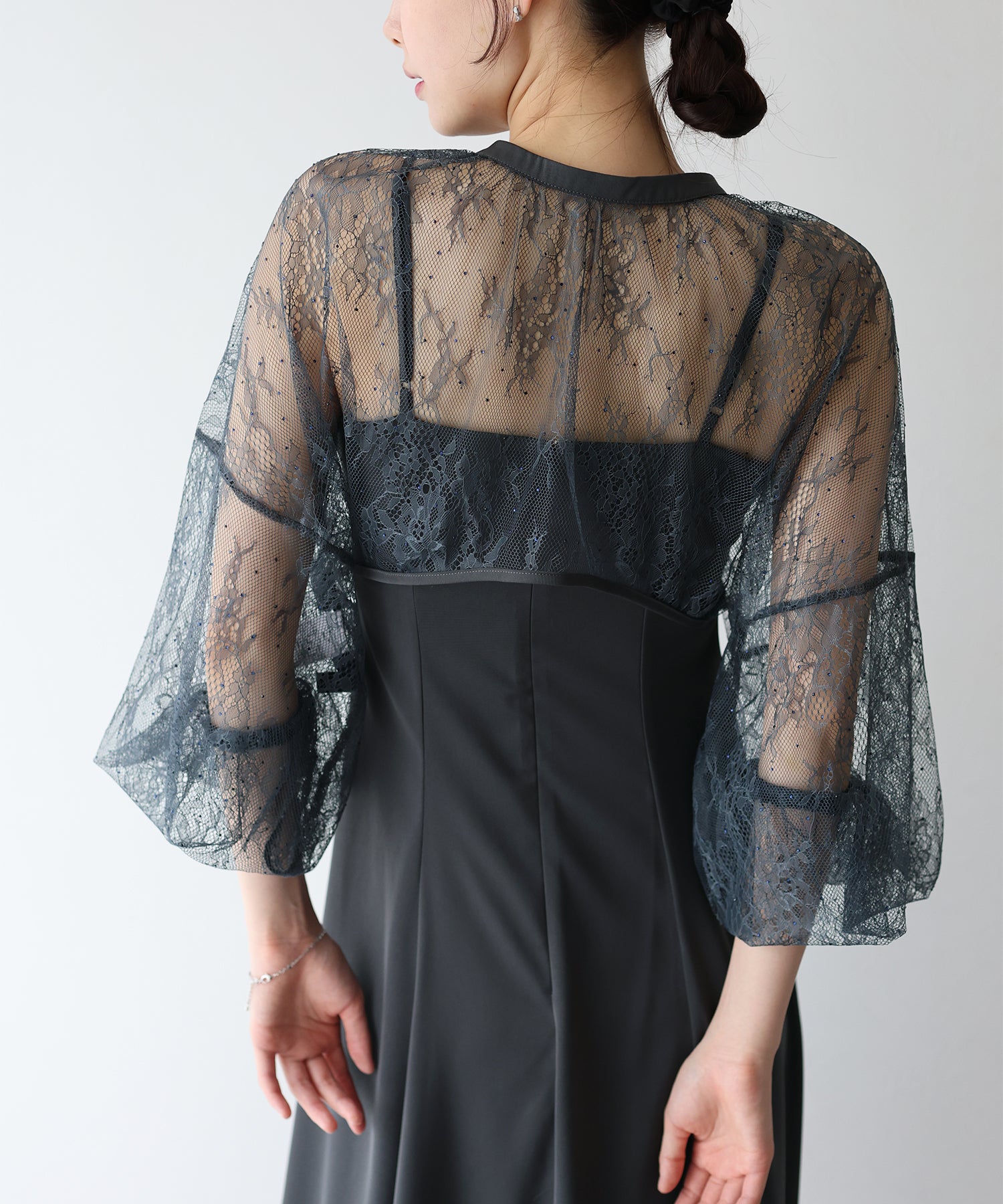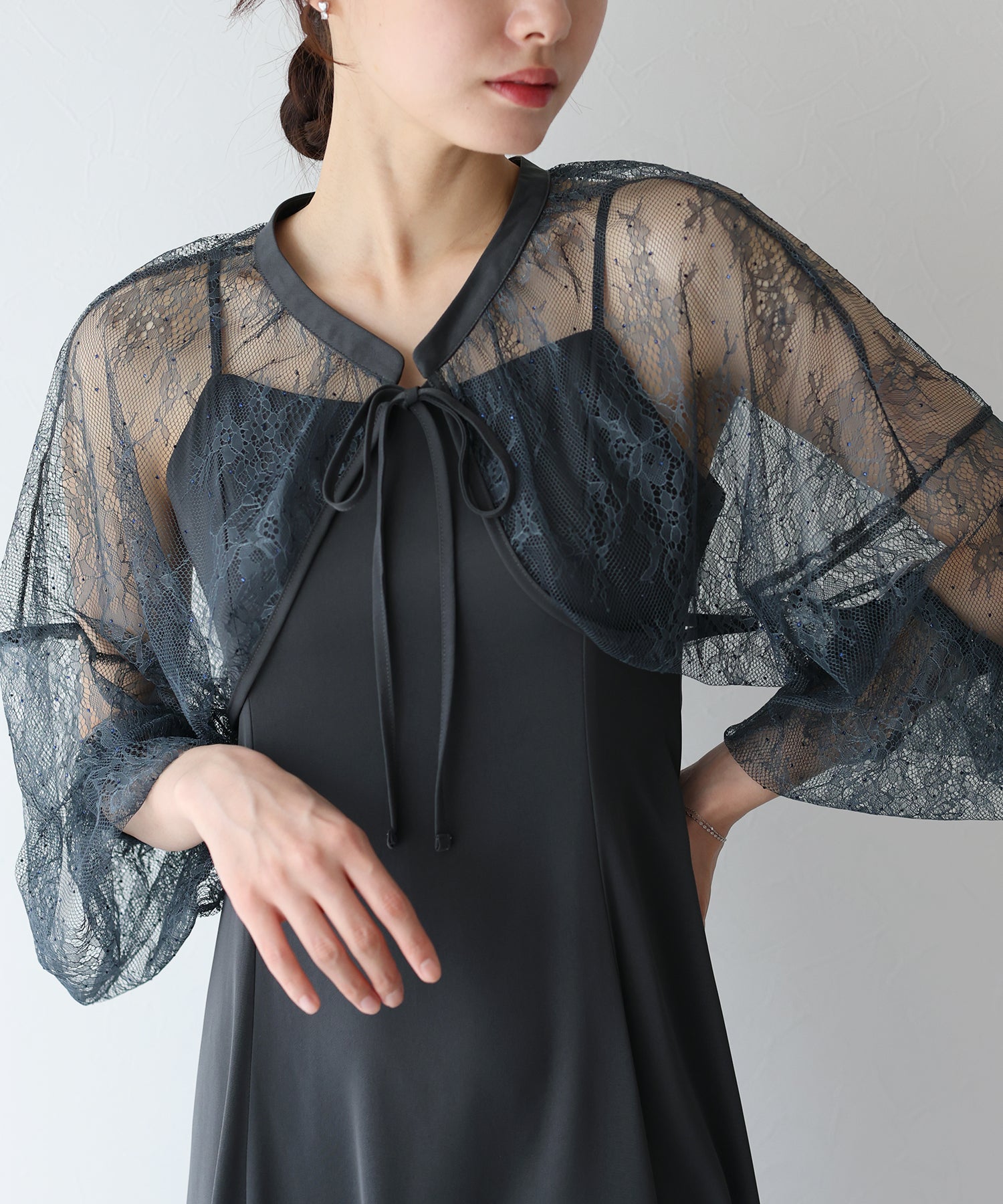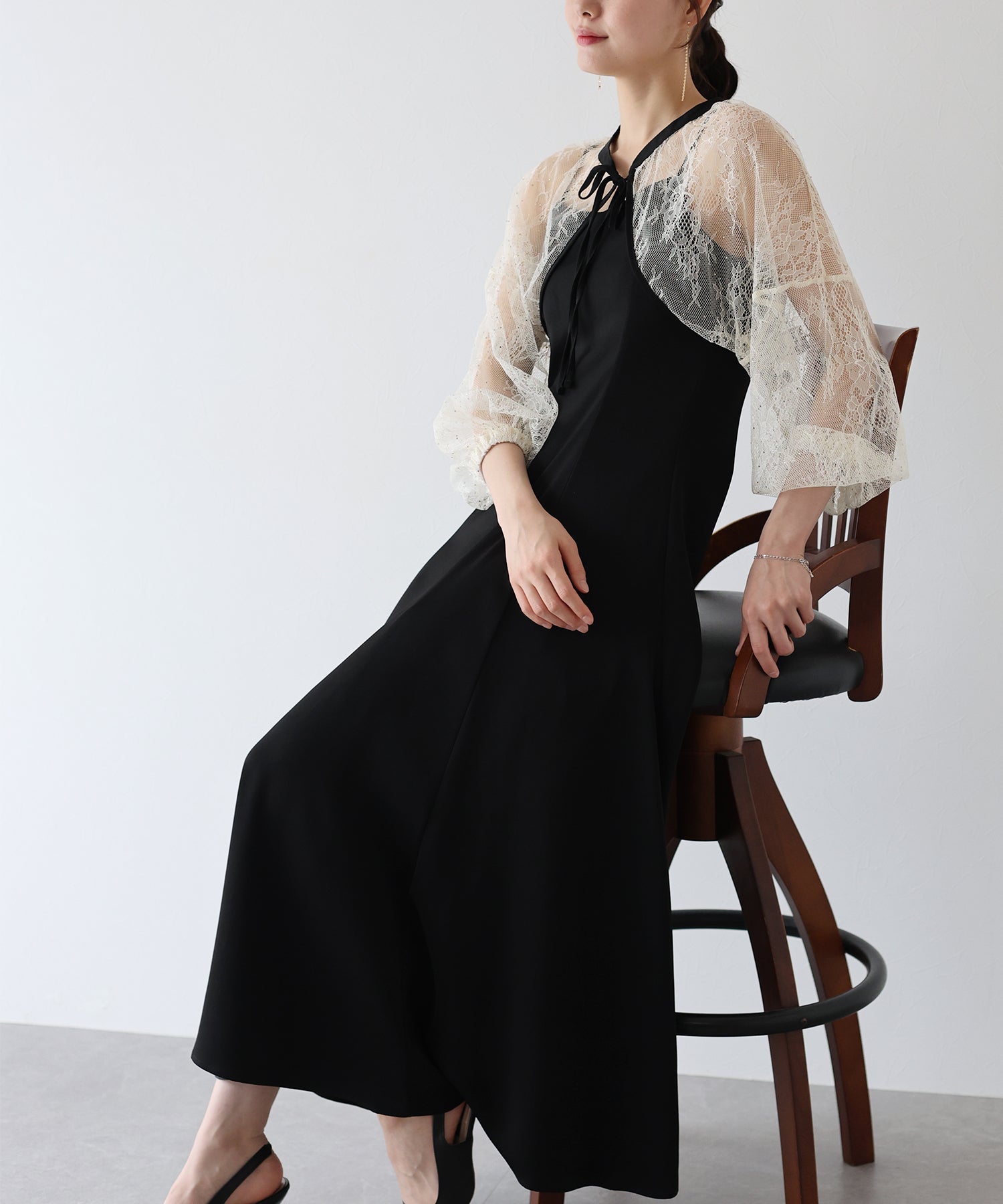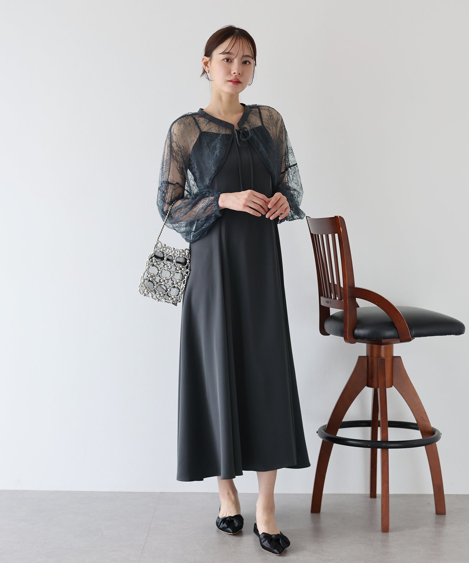 ショート丈のレースボレロとワンピースのシルエットでメリハリがつきすっきり見えるパーティードレス。