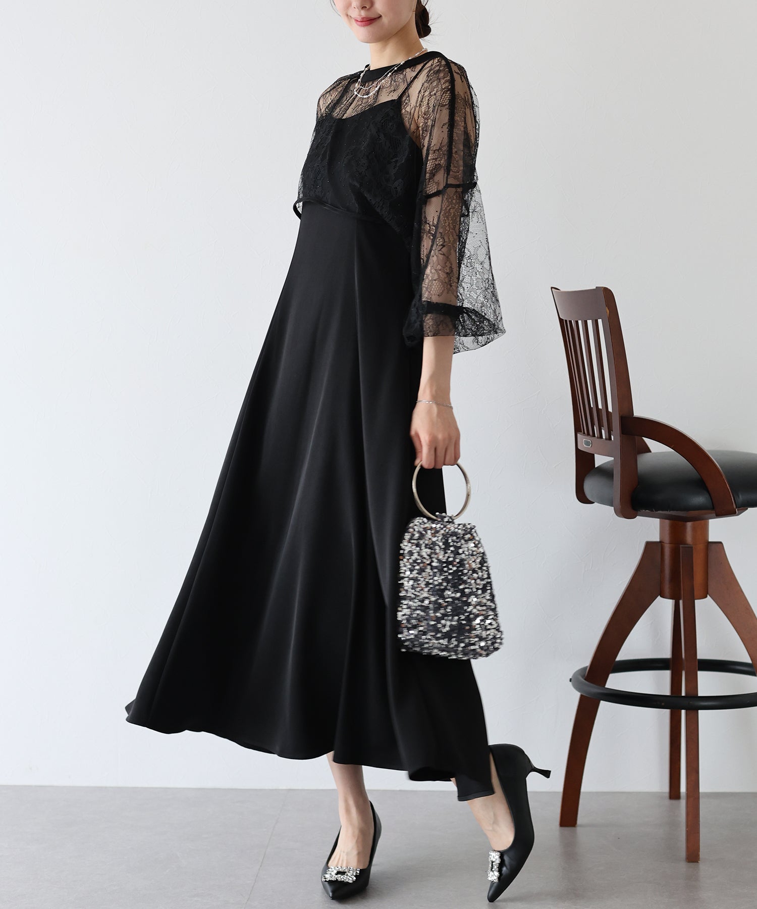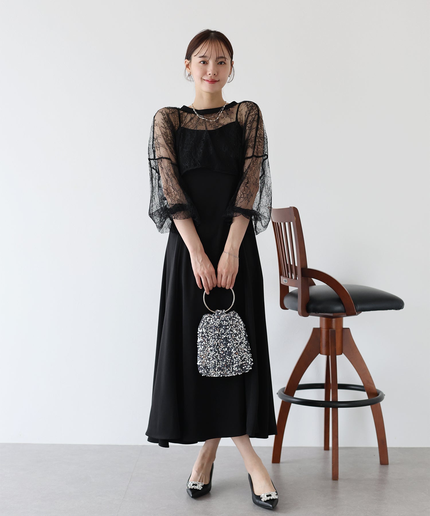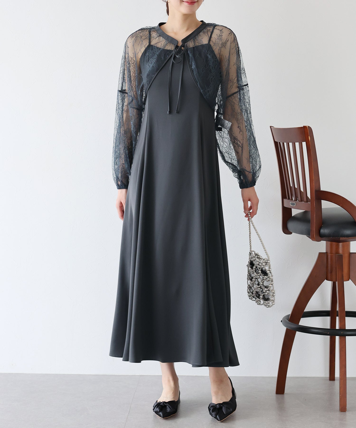 ショート丈のレースボレロとワンピースのシルエットでメリハリがつきすっきり見えるパーティードレス。
