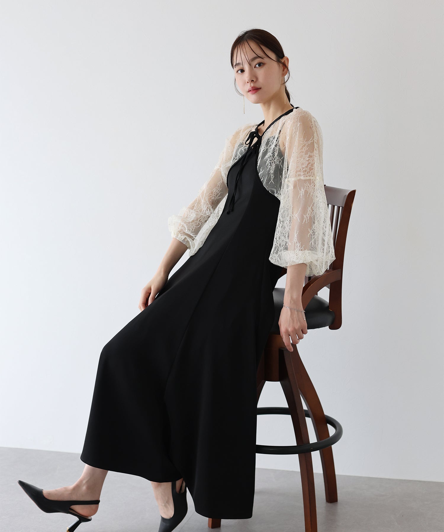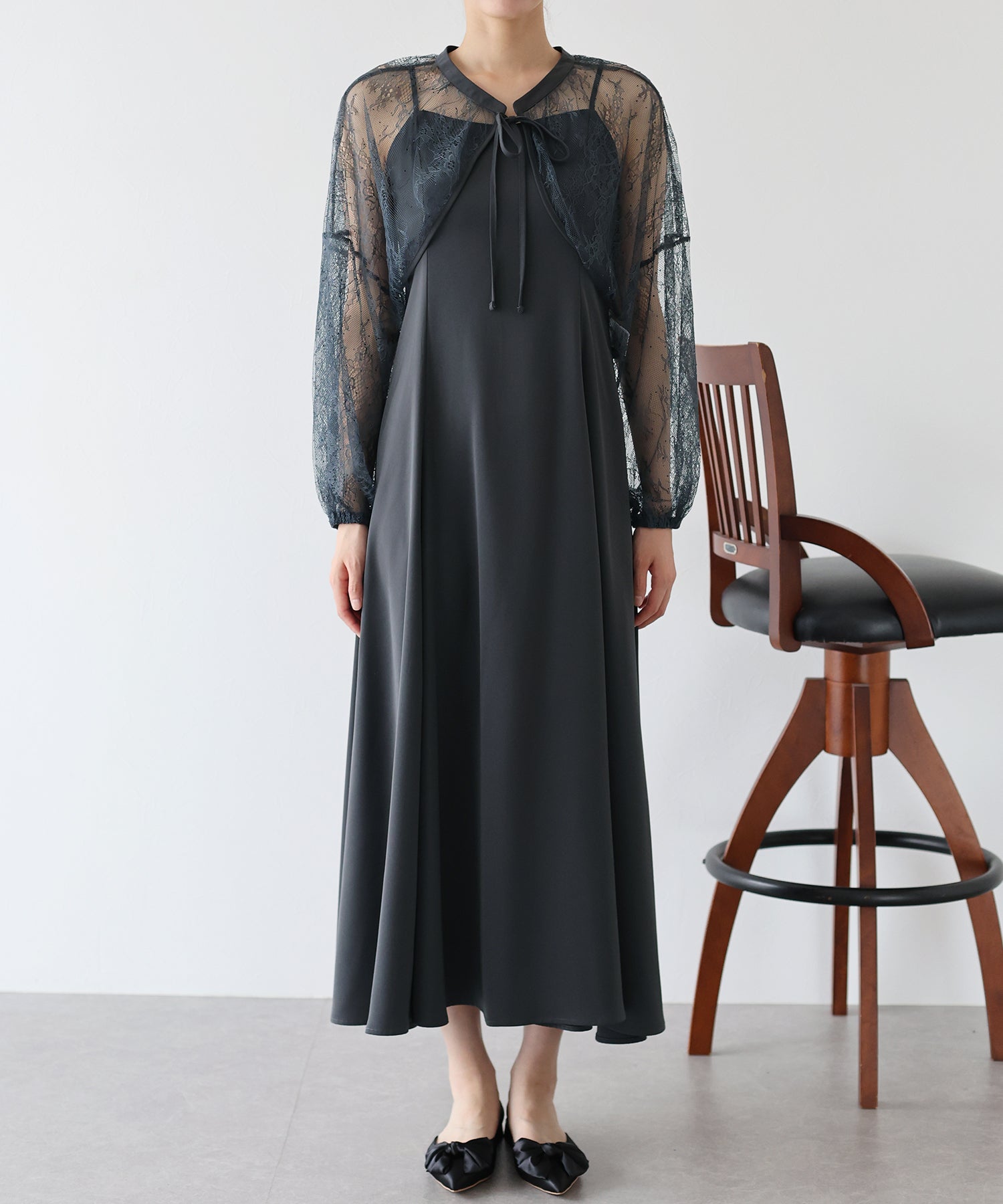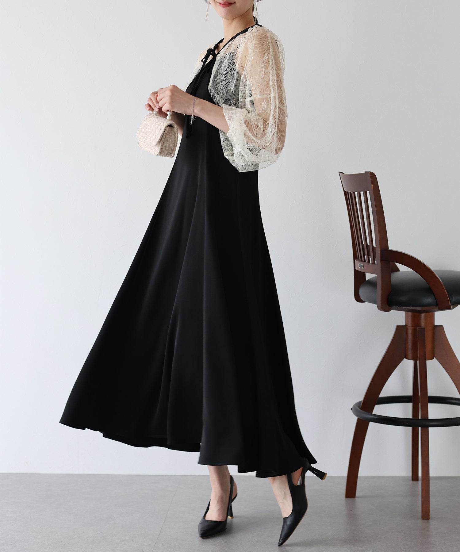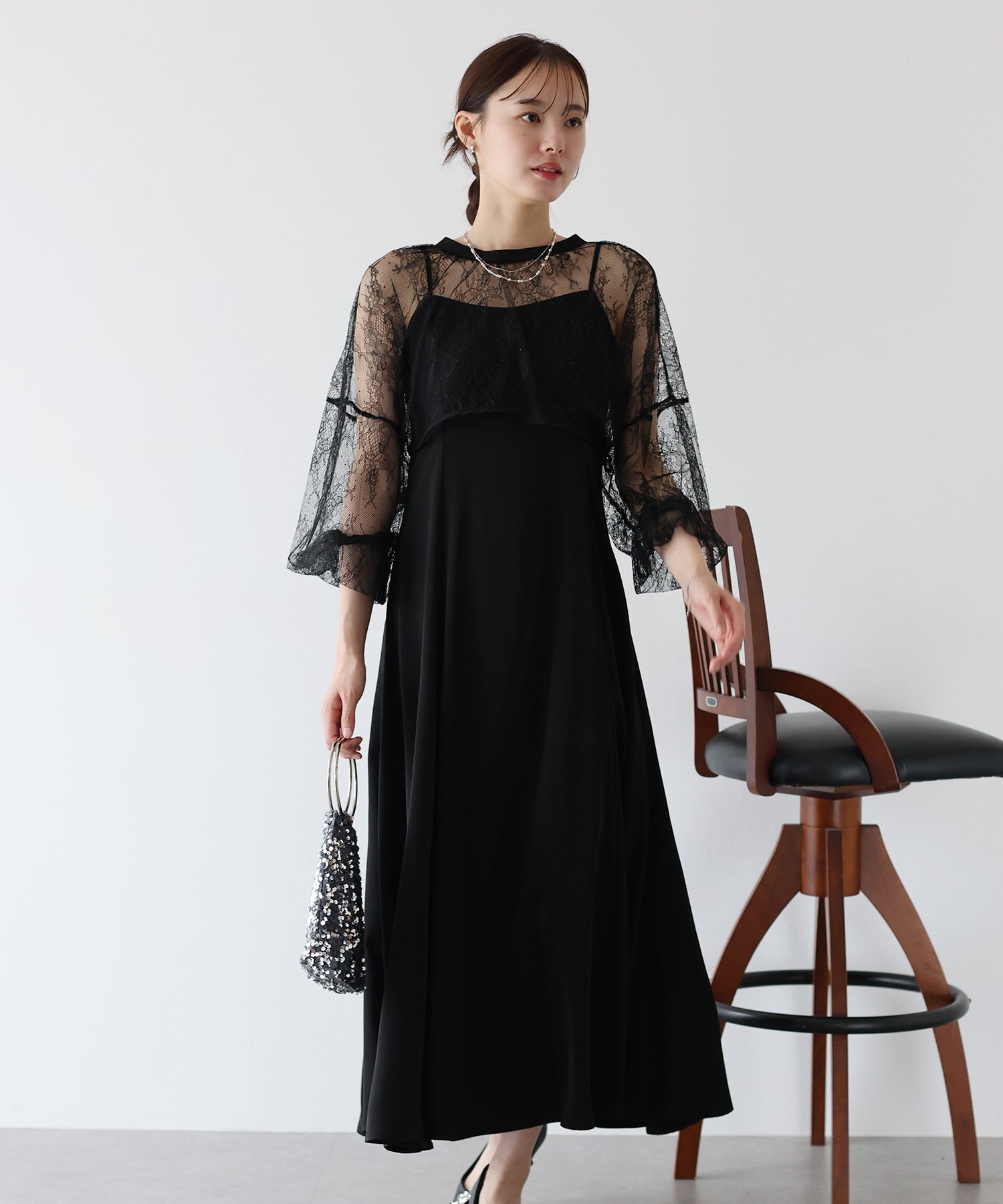 ショート丈のレースボレロとワンピースのシルエットでメリハリがつきすっきり見えるパーティードレス。