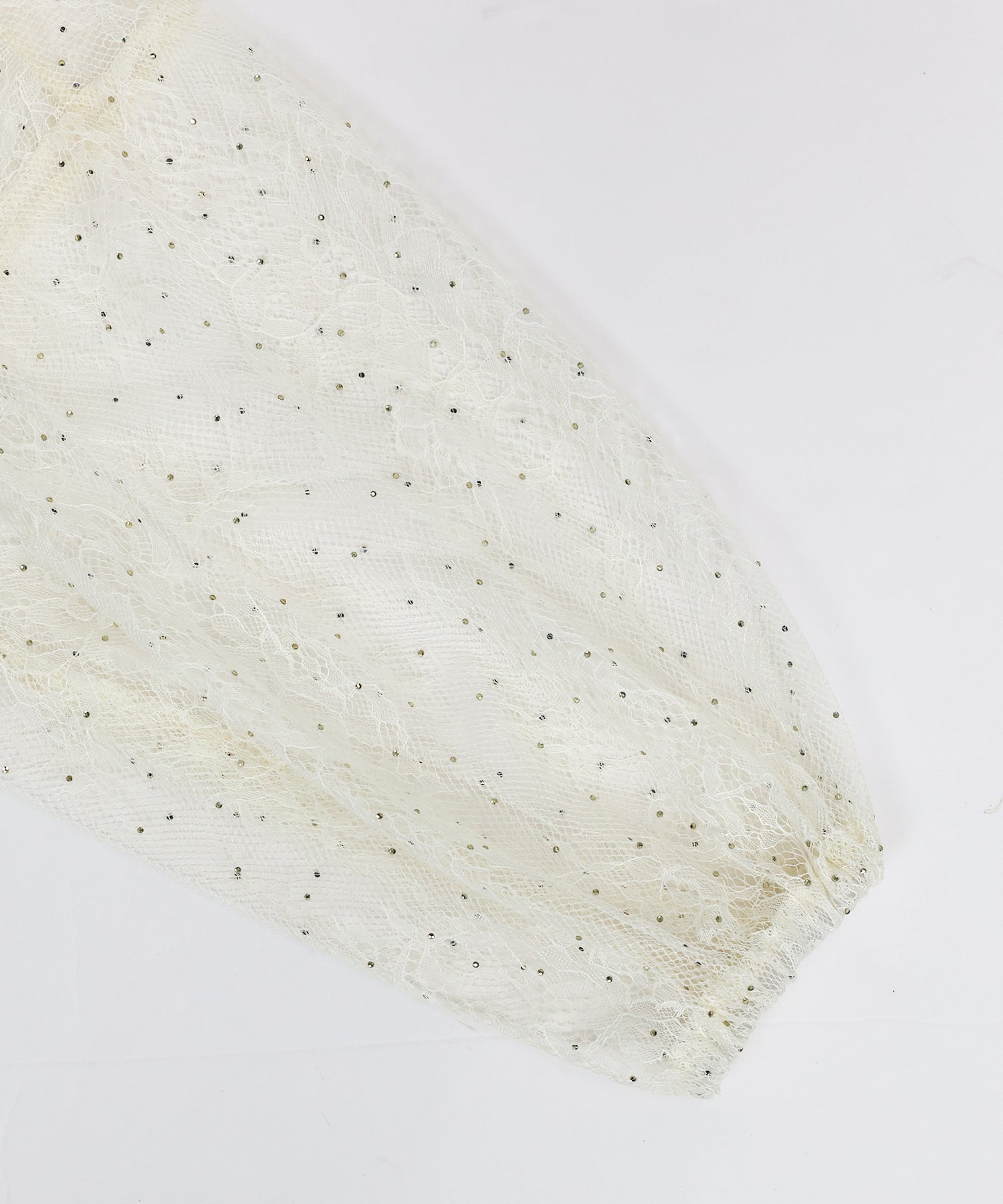 ブラウスは透け感が大人っぽく、きらきらと煌めくビジュー付きで可愛らしさを引き立てるデザイン。