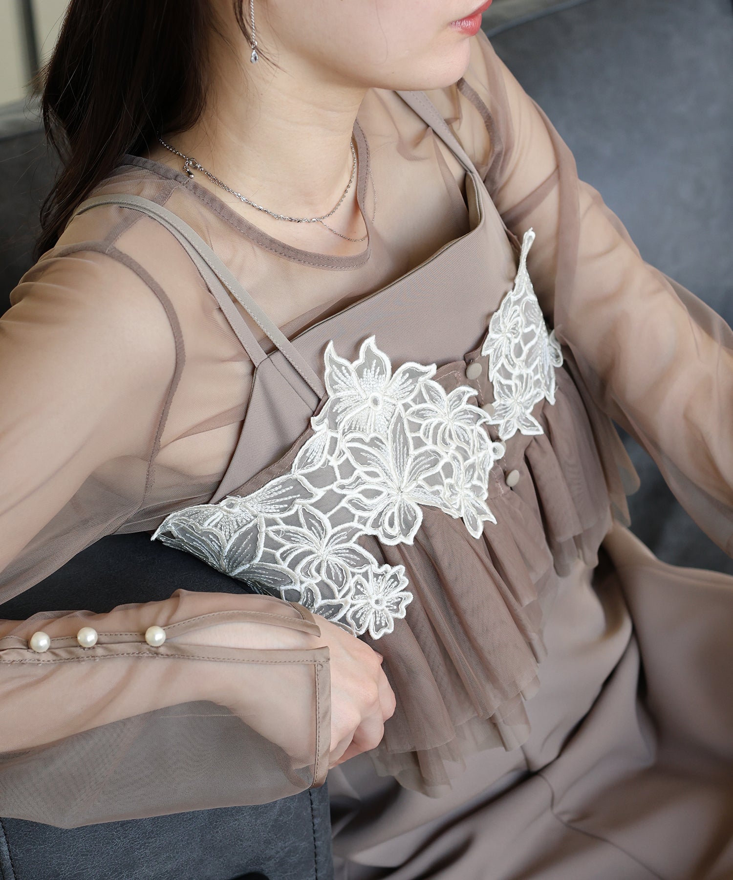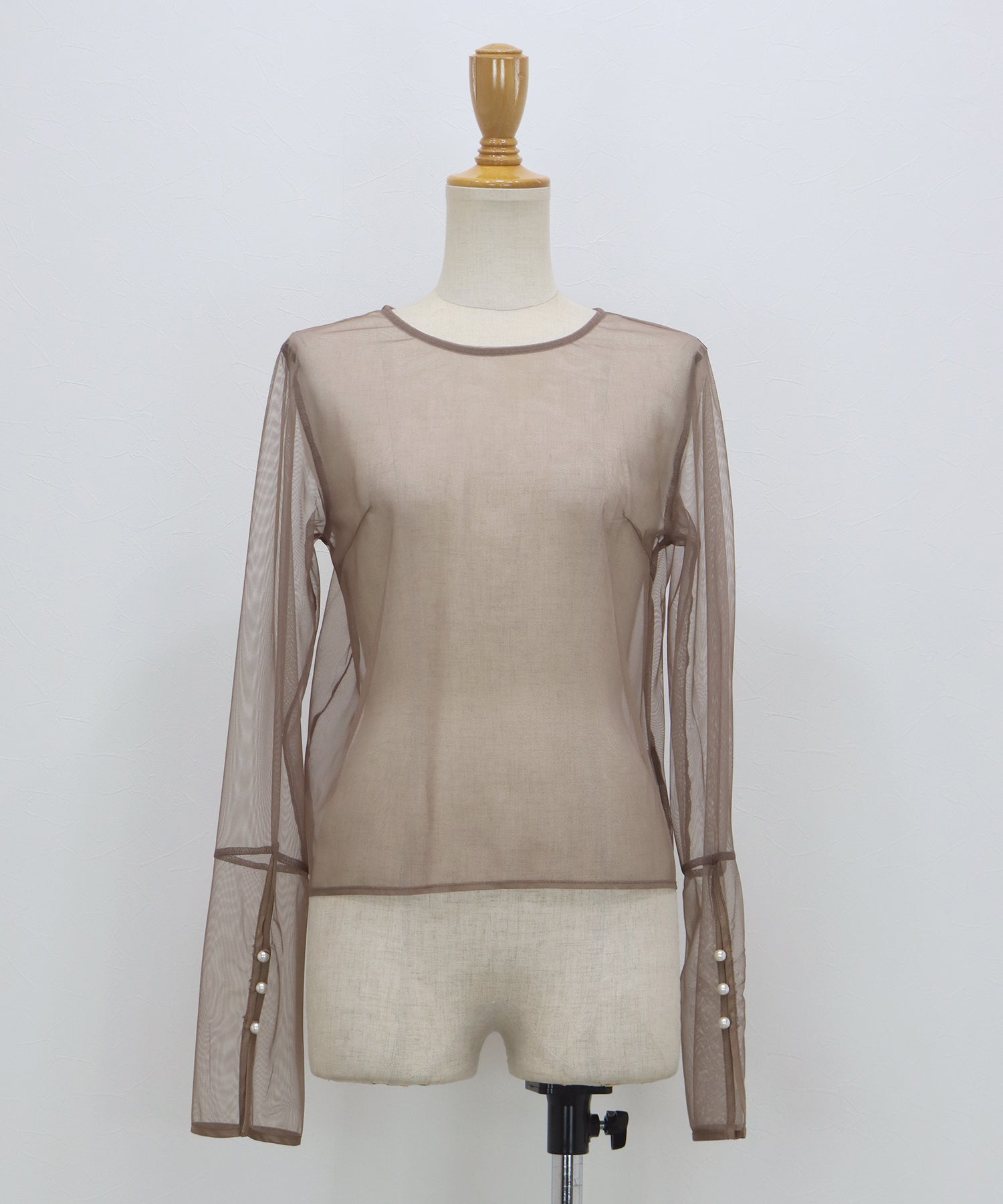 シアートップスには袖口にパールをあしらい、上品さをプラスしました。