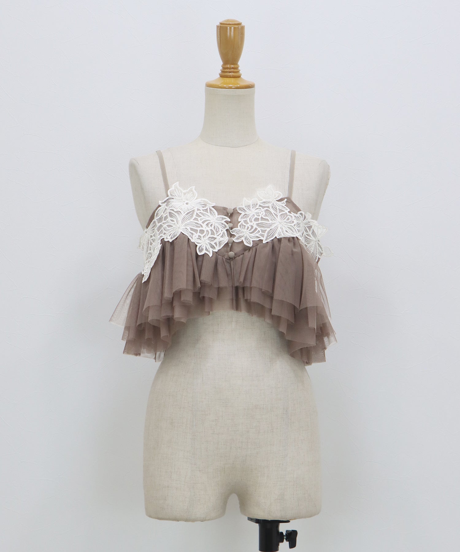 レースビスチェは立体感のあるフリルデザインで女性らしい華やかさを引き立てます。