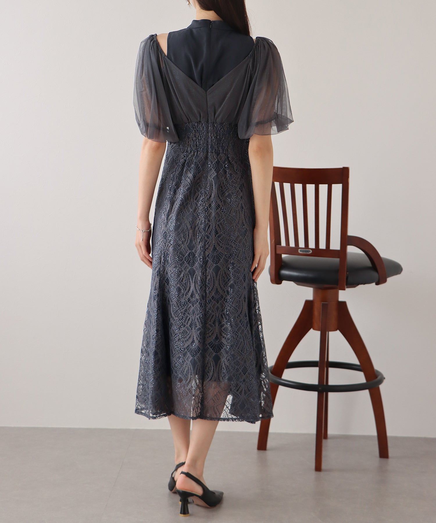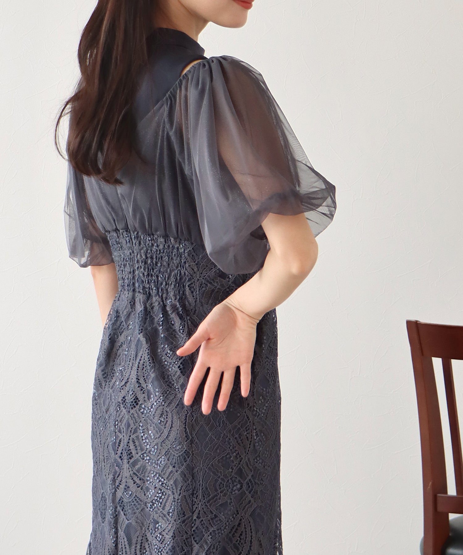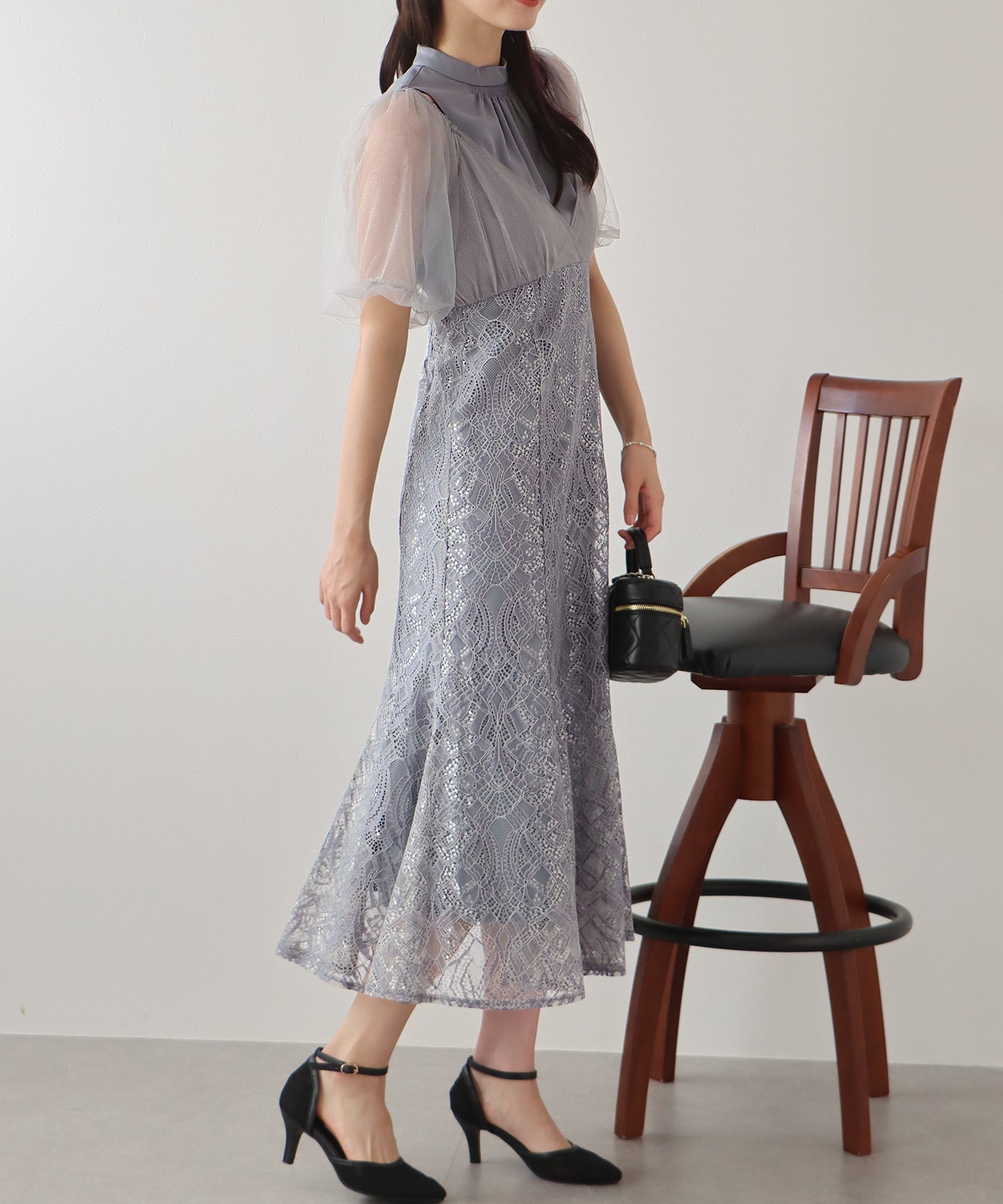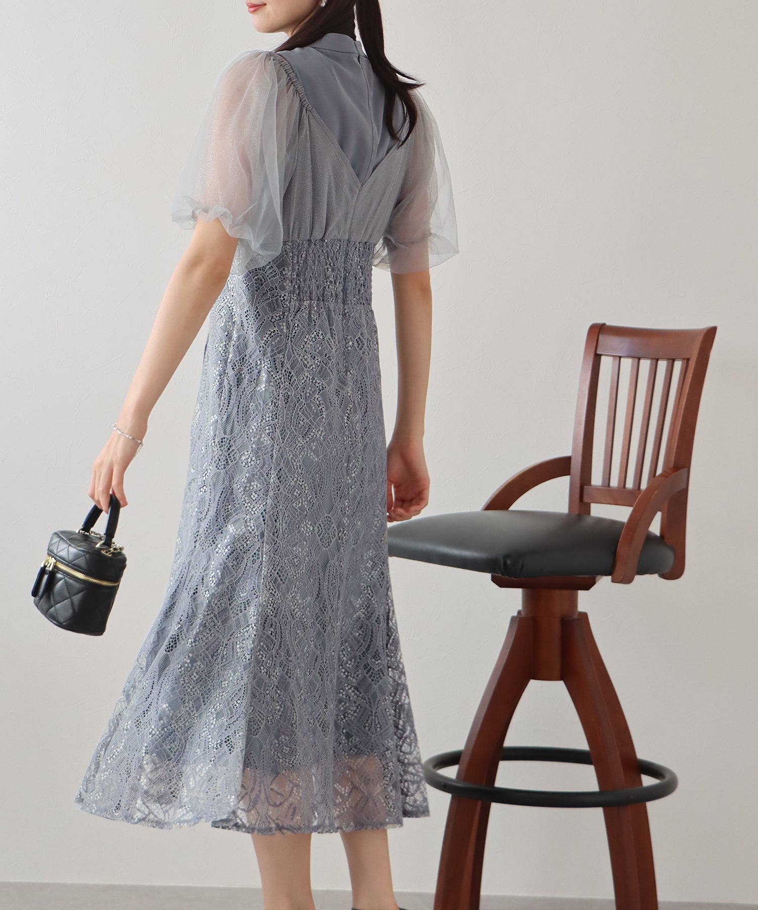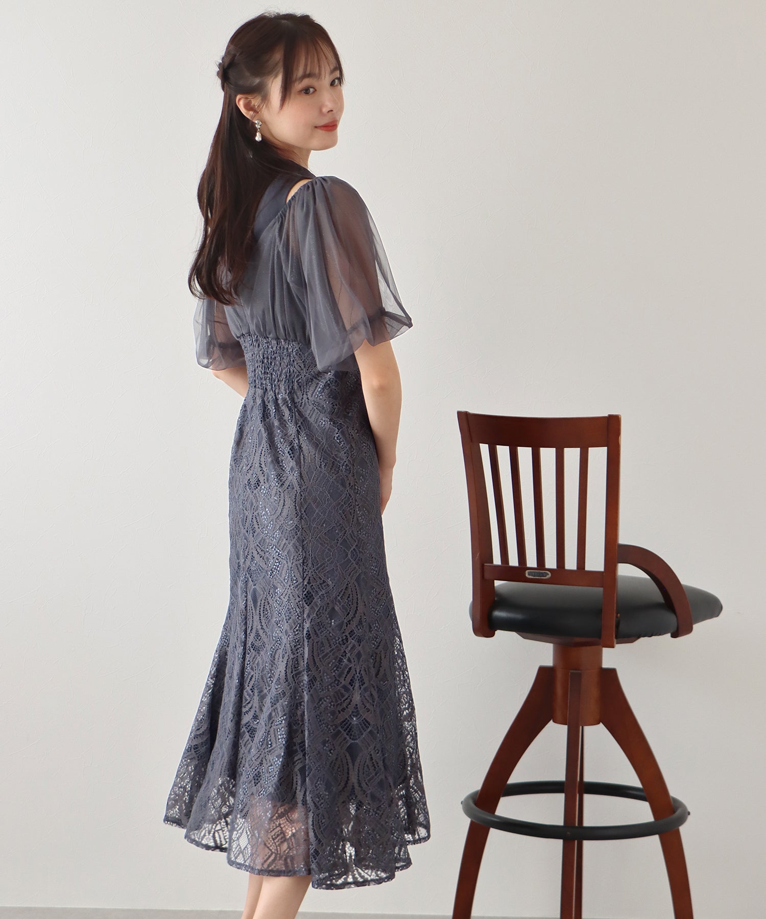 チュールをふんわりと重ねたパフスリーブのマーメイドシルエットのパーティーワンピース・結婚式ワンピース