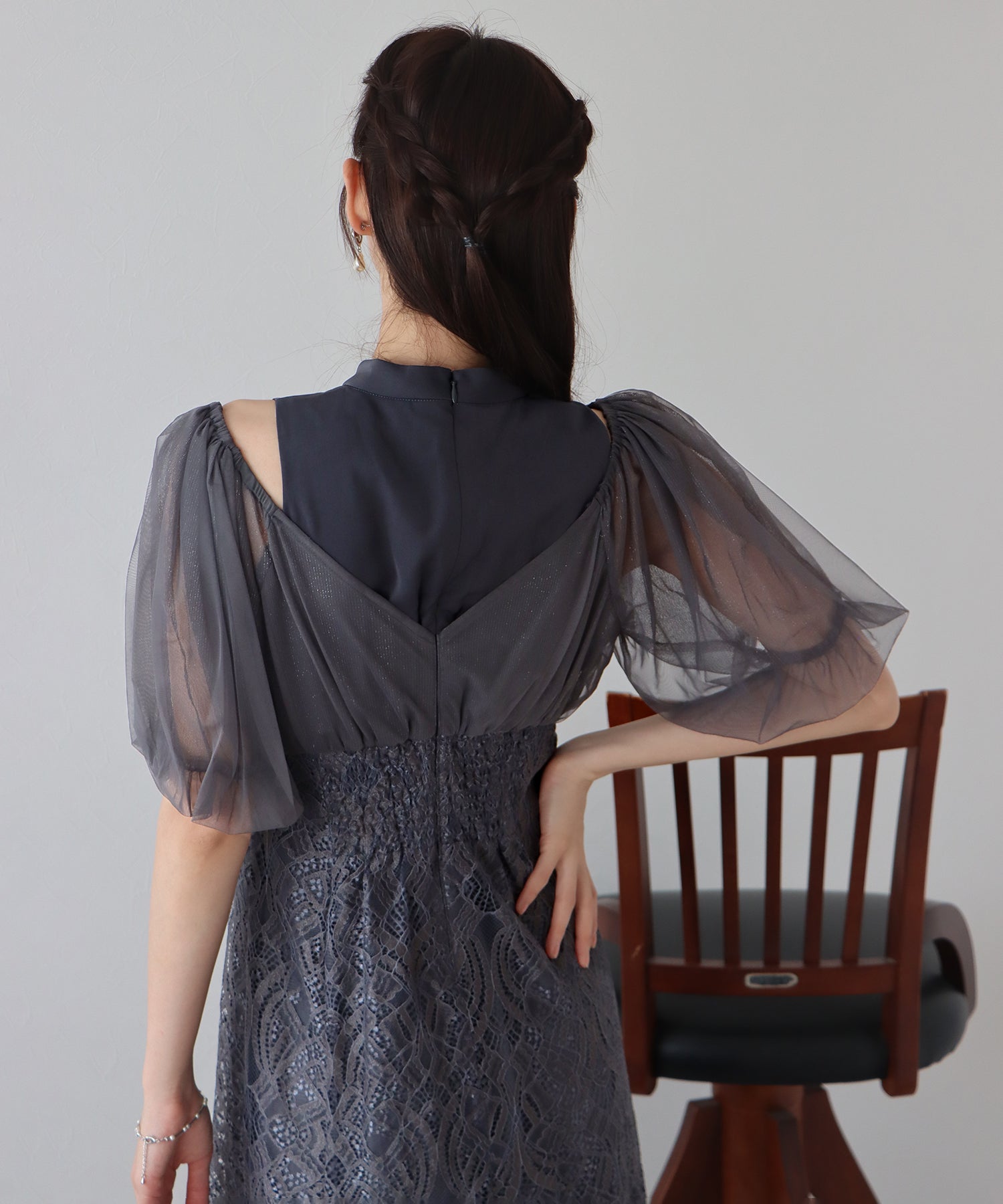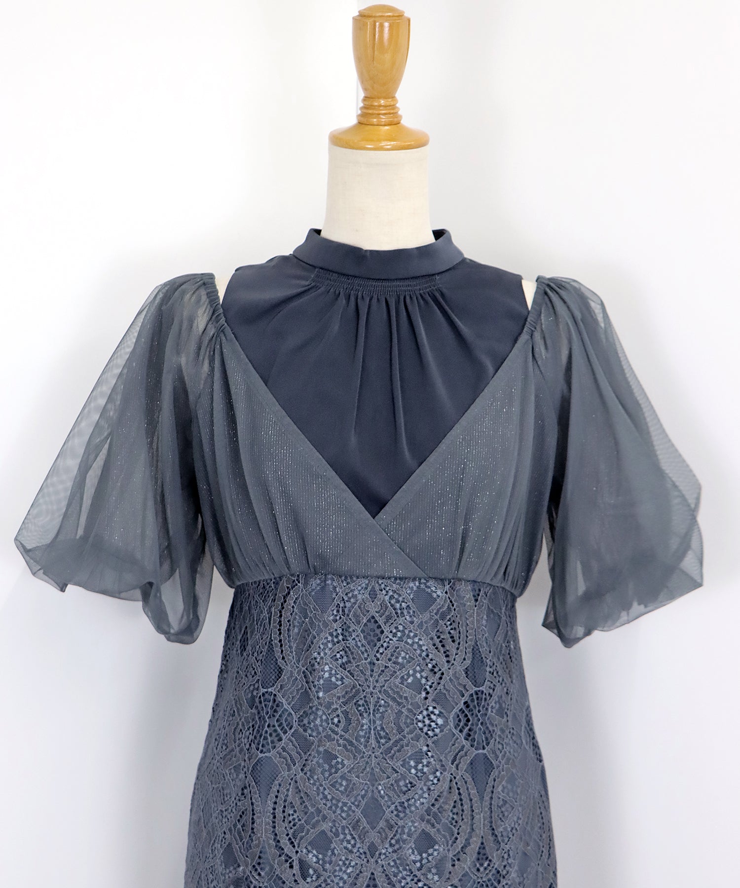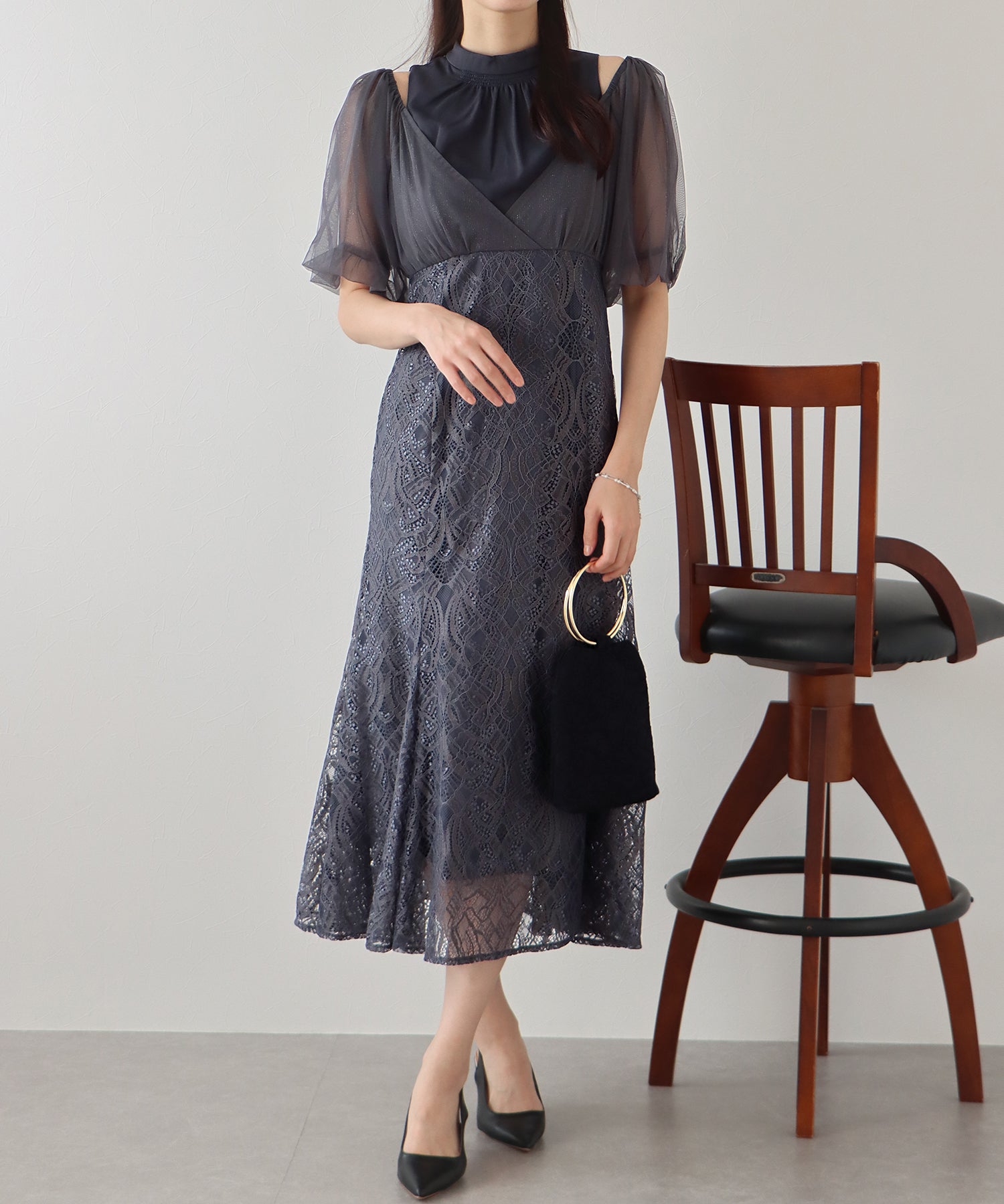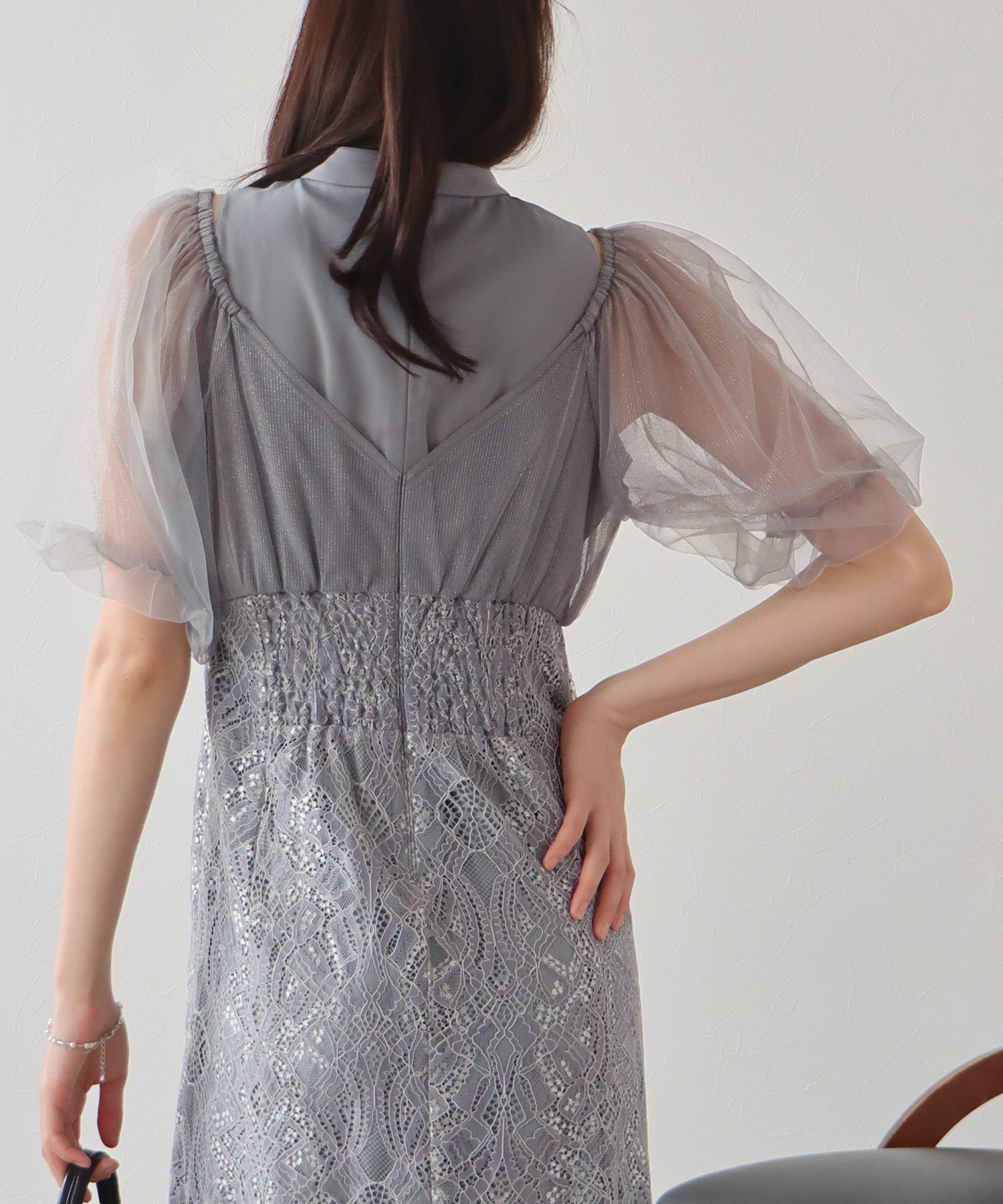 チュールをふんわりと重ねたパフスリーブのマーメイドシルエットのパーティーワンピース・結婚式ワンピース