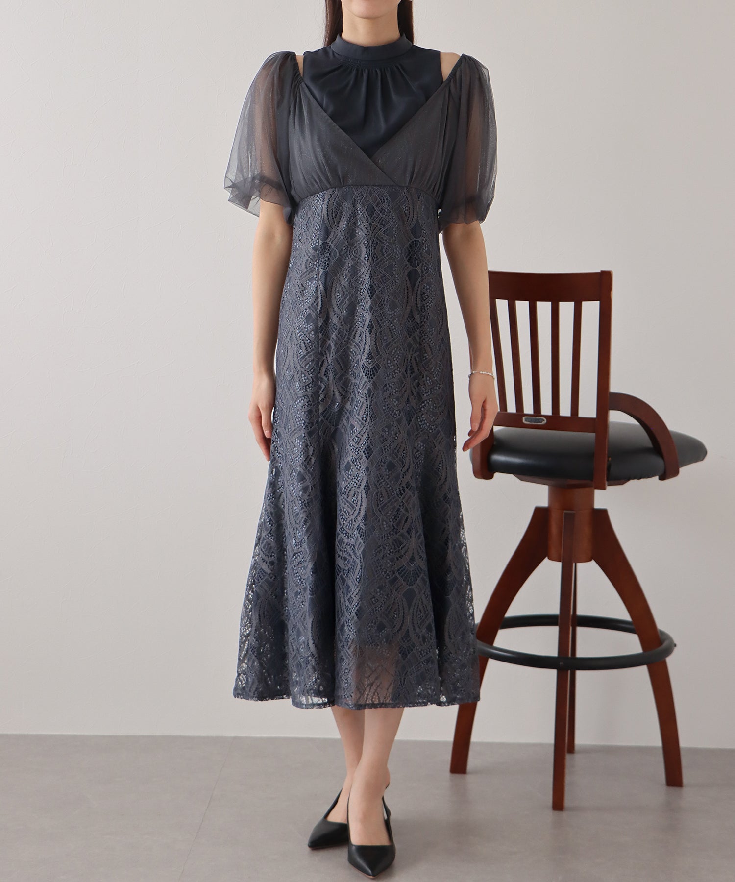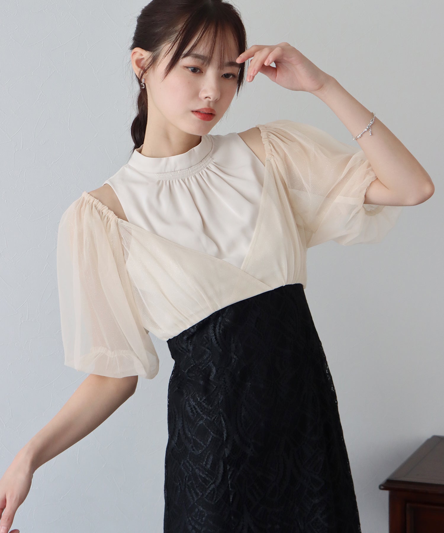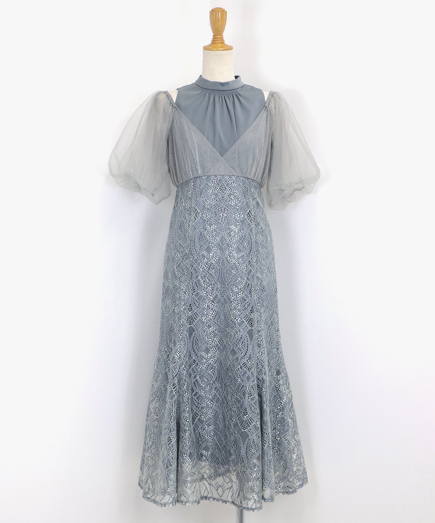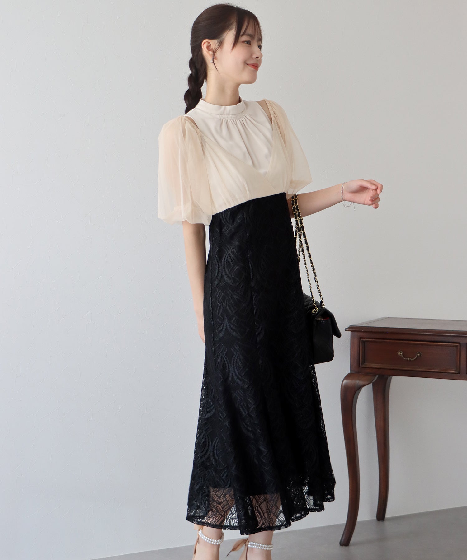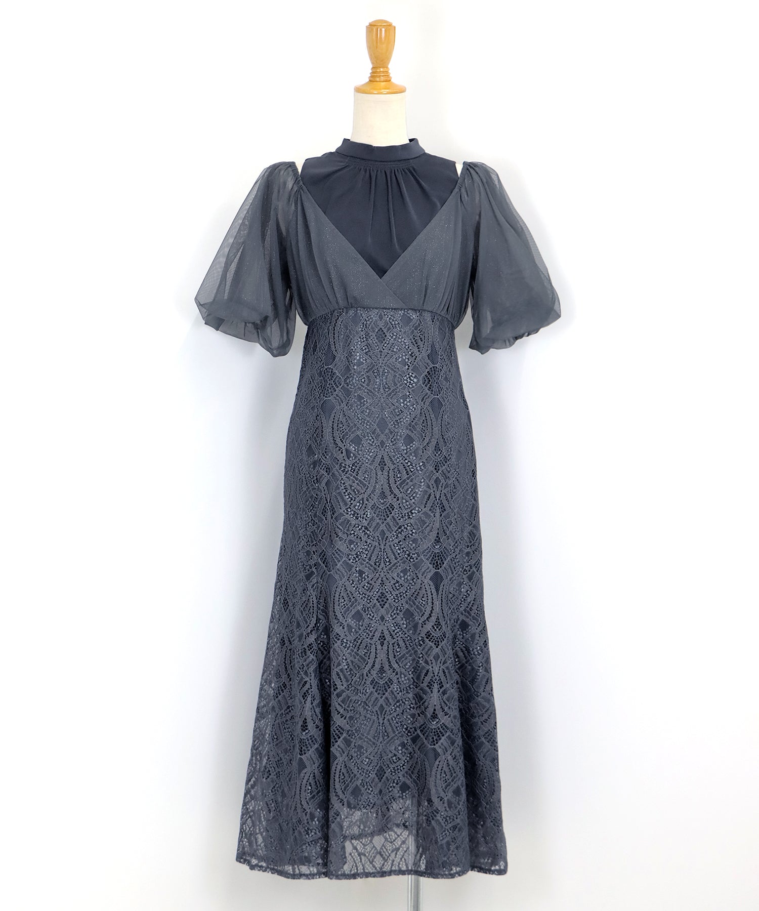 チュールをふんわりと重ねたパフスリーブのマーメイドシルエットのパーティーワンピース・結婚式ワンピース