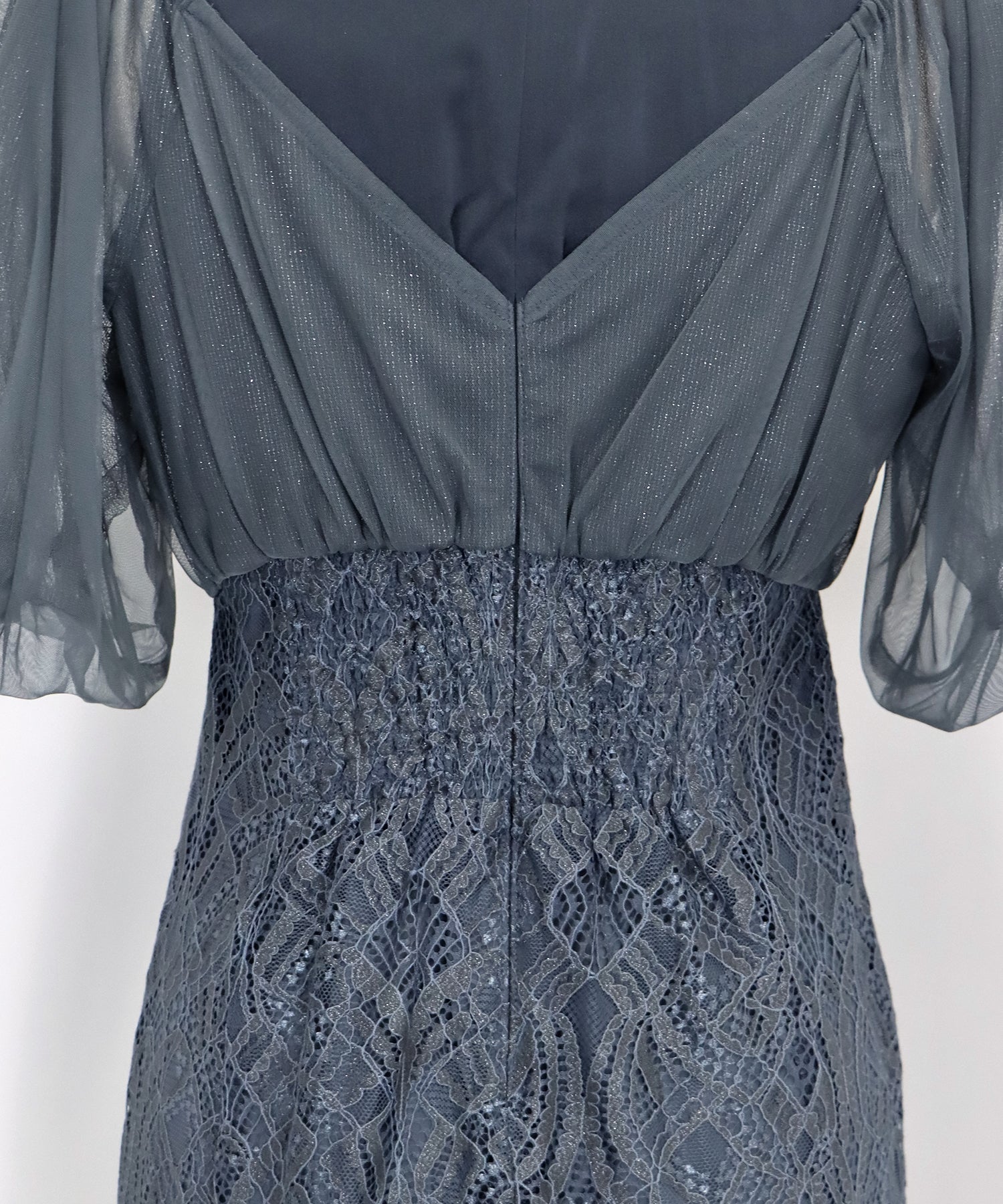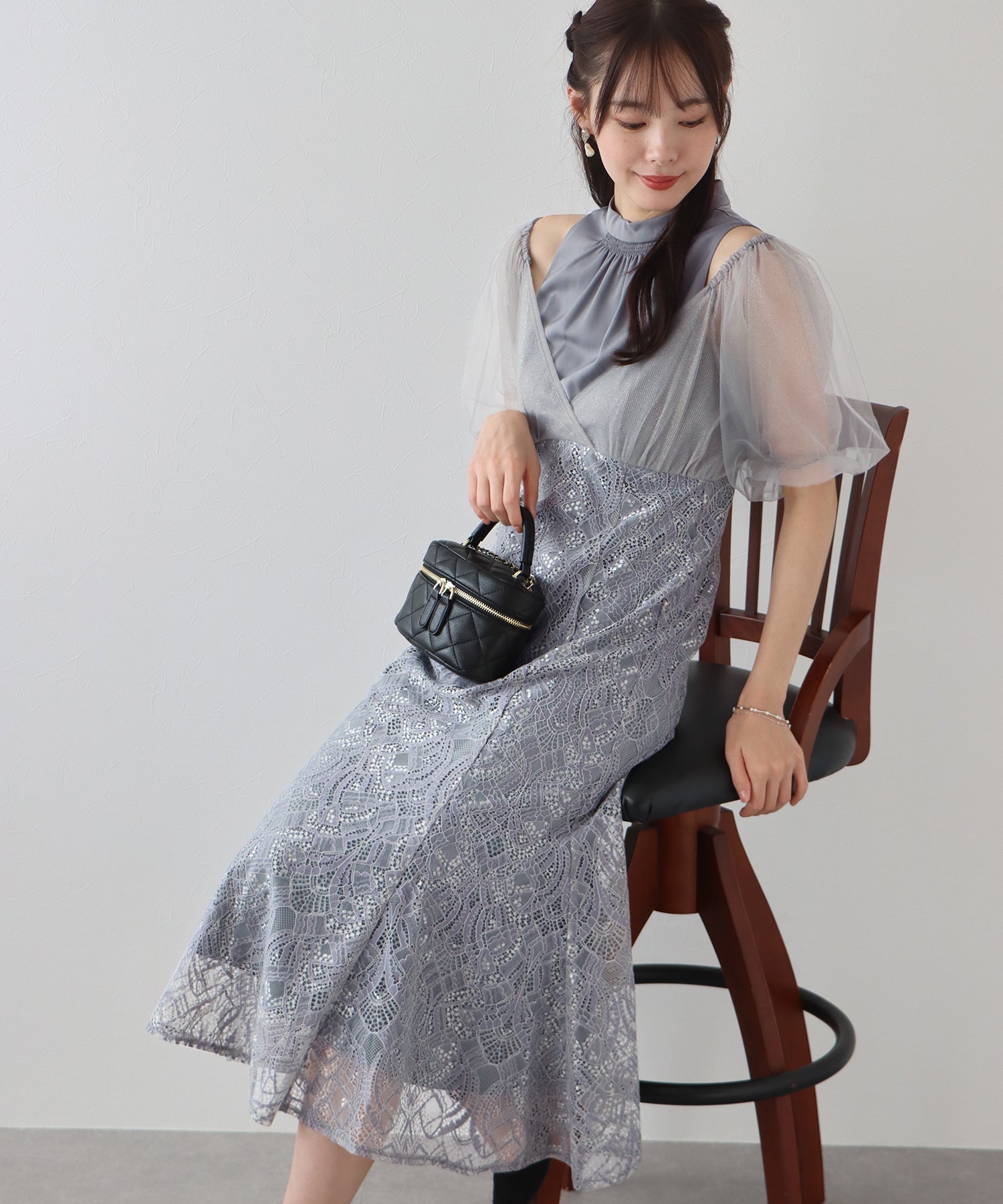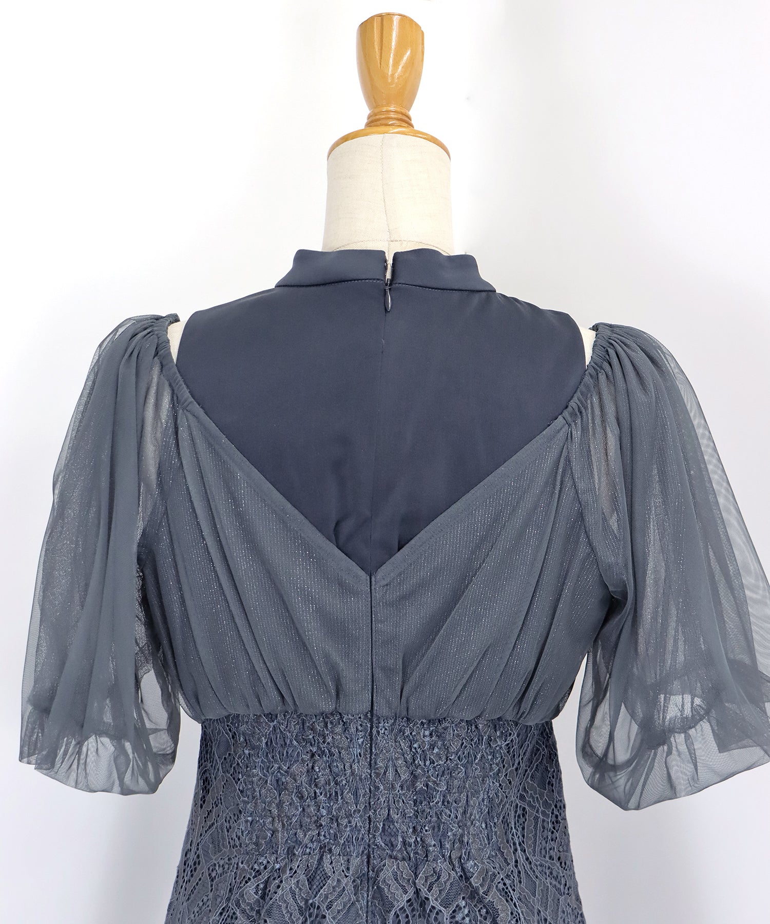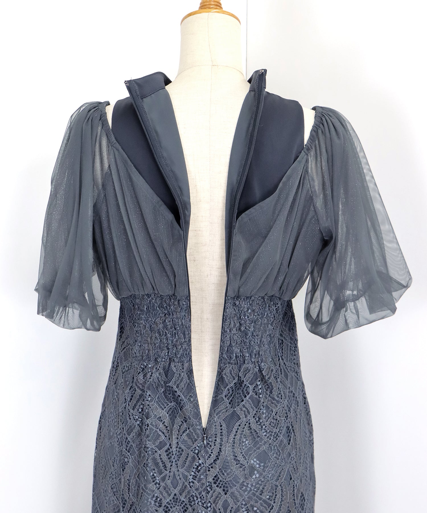 チュールをふんわりと重ねたパフスリーブのマーメイドシルエットのパーティーワンピース・結婚式ワンピース