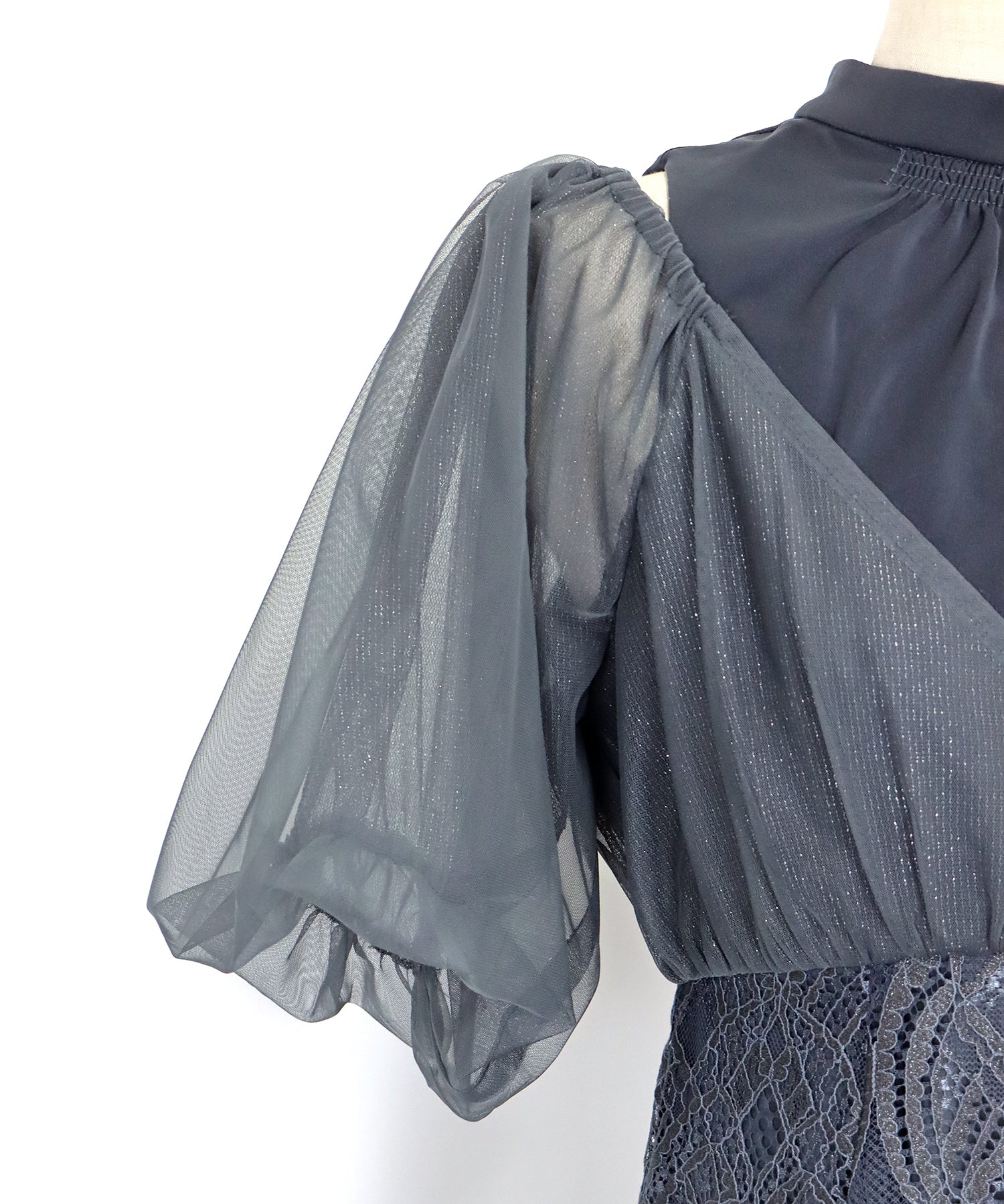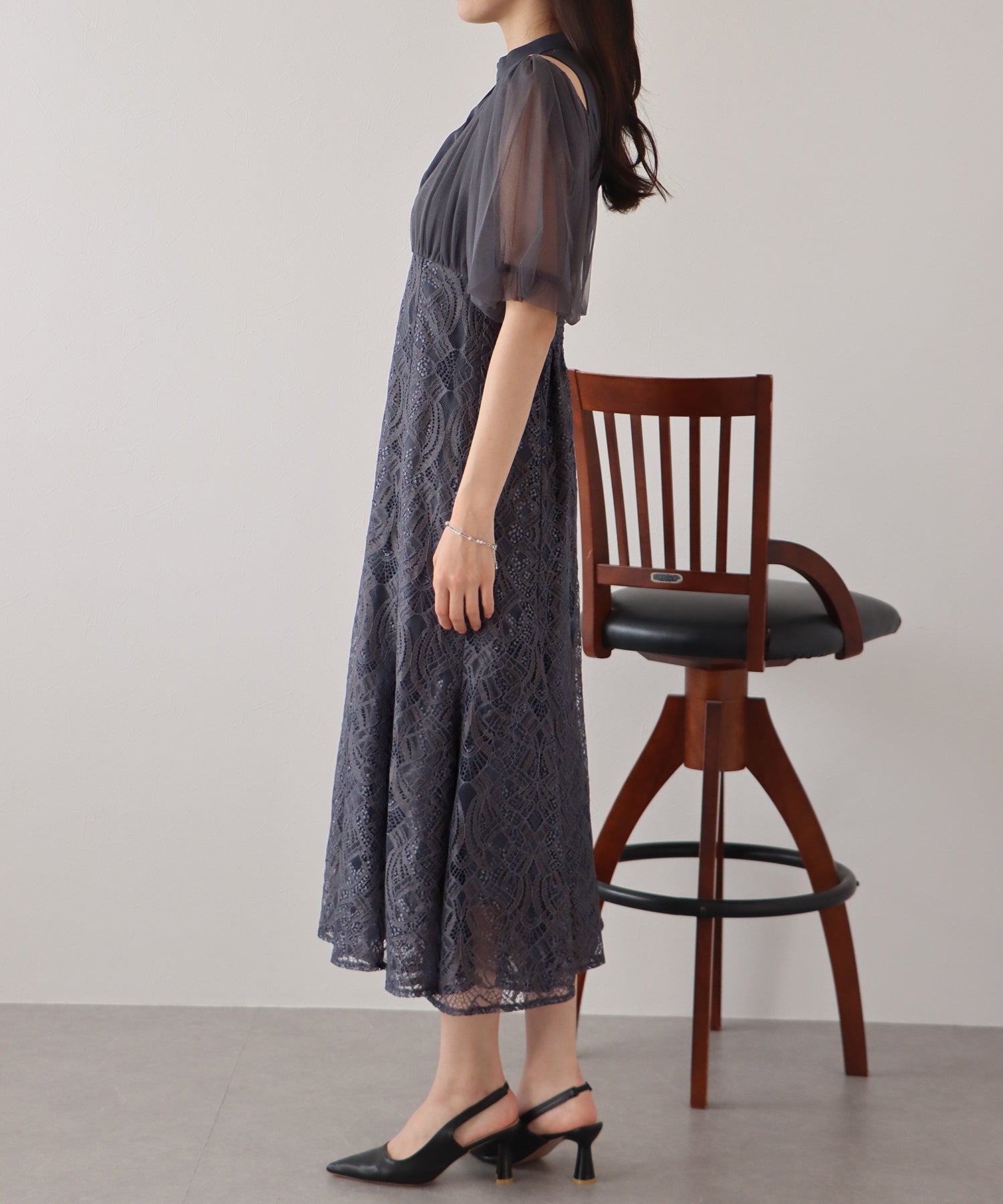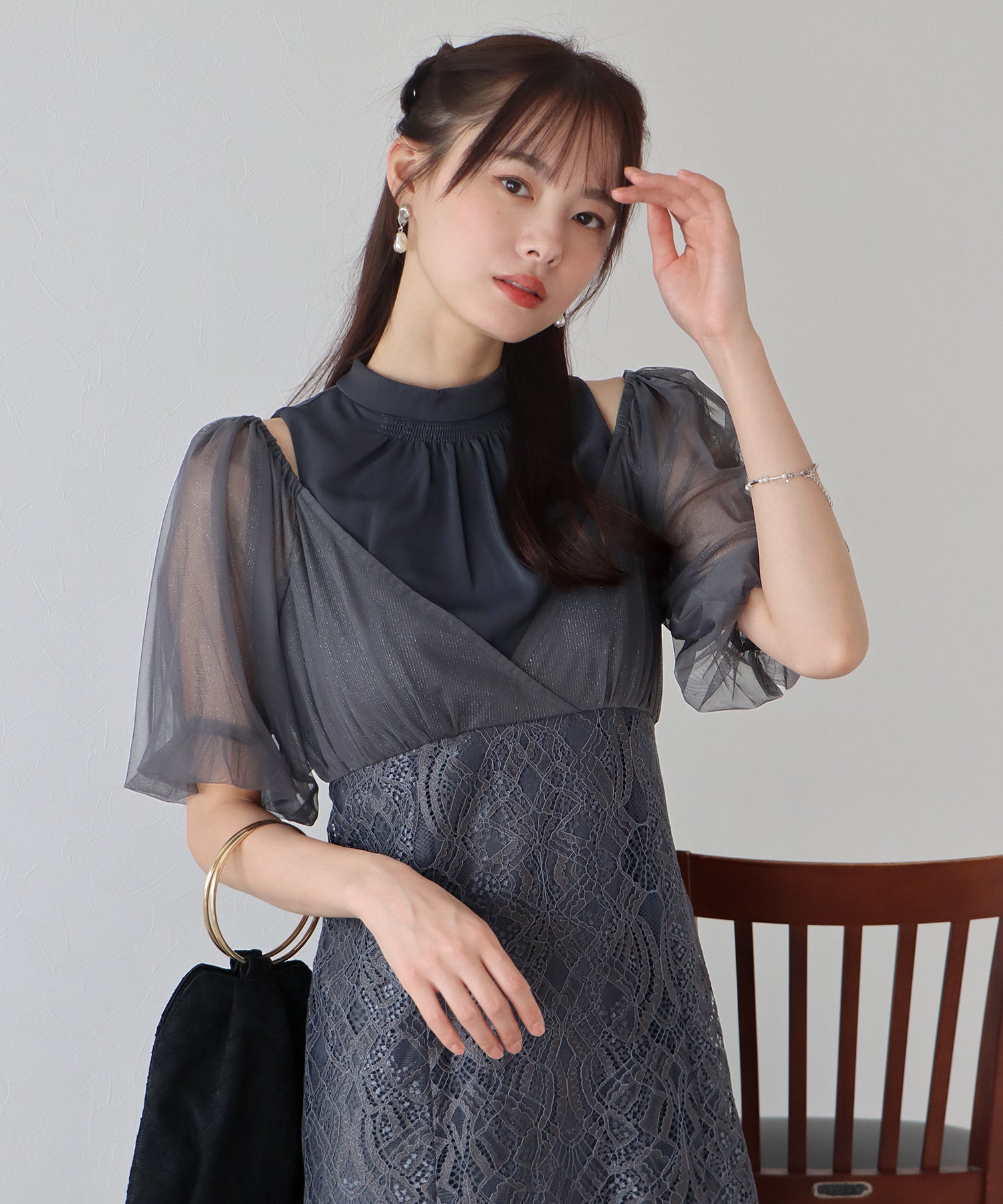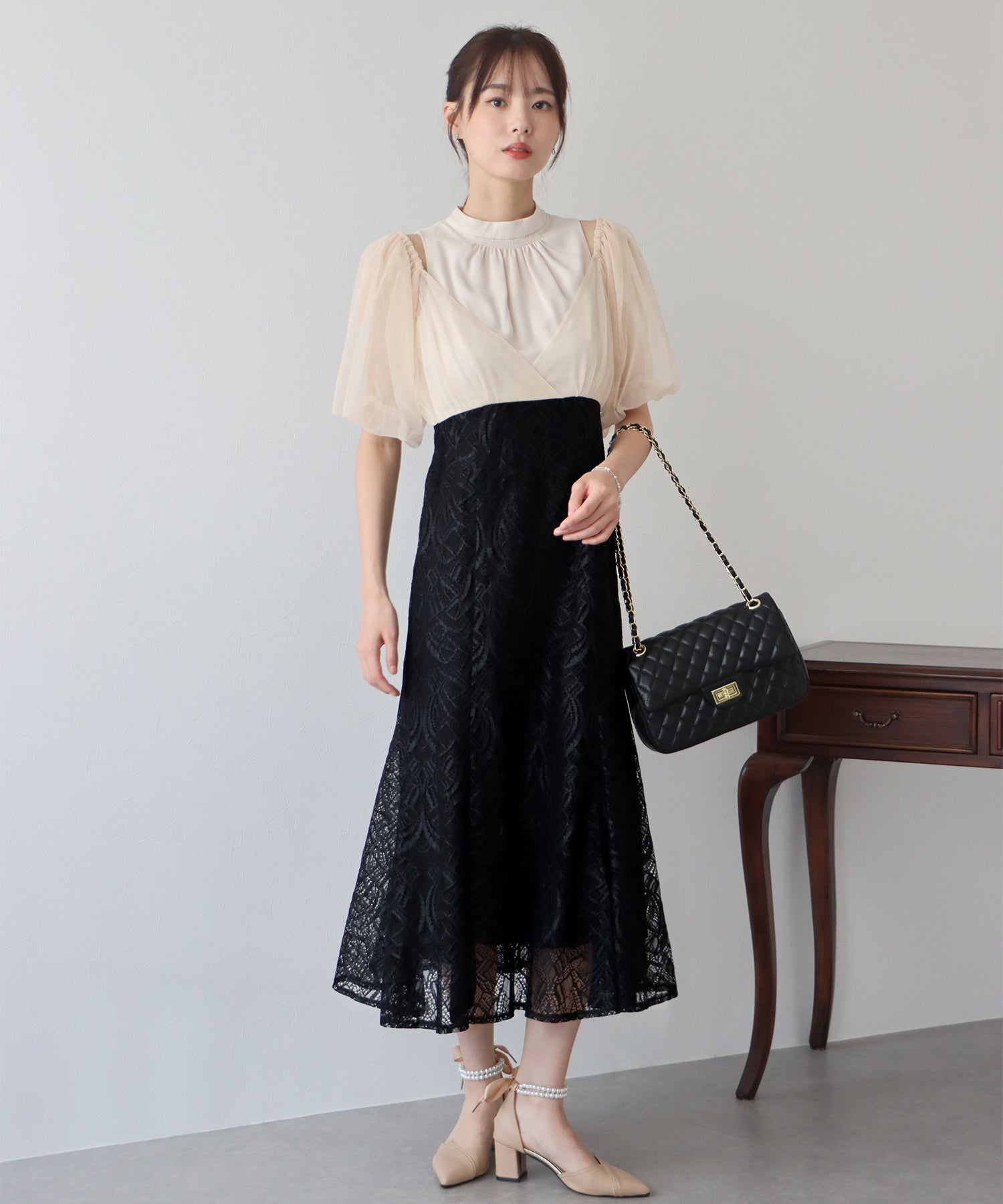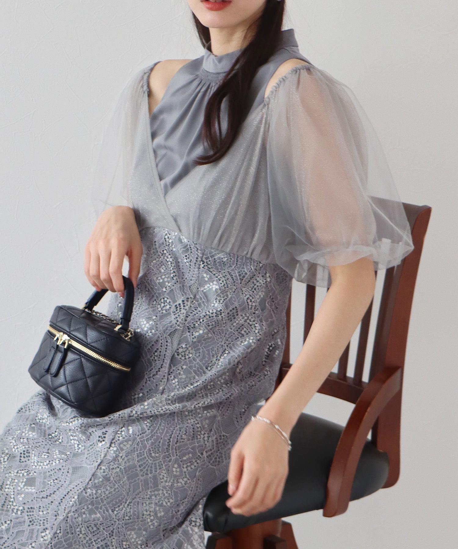 チュールをふんわりと重ねたパフスリーブのマーメイドシルエットのパーティーワンピース・結婚式ワンピース
