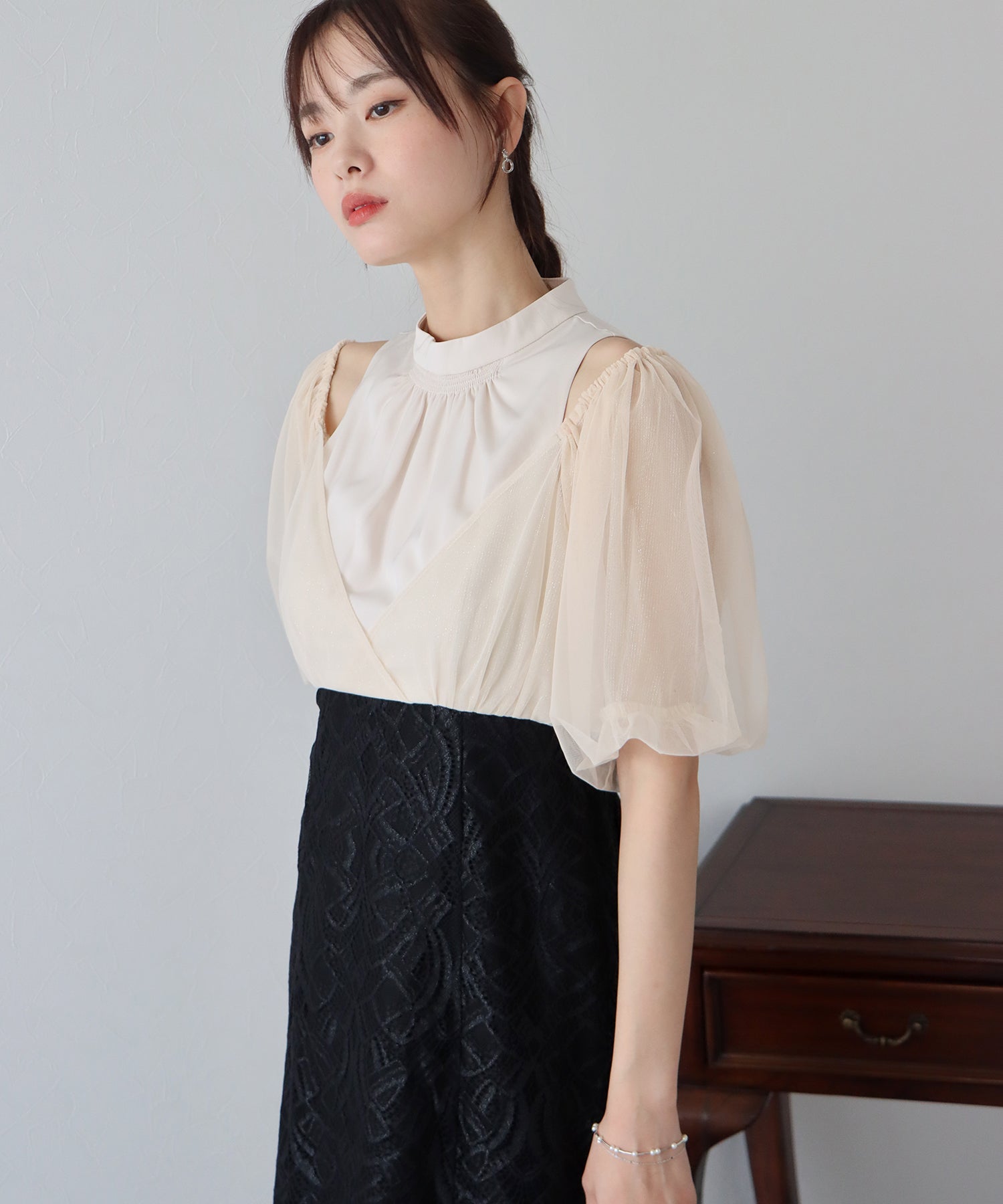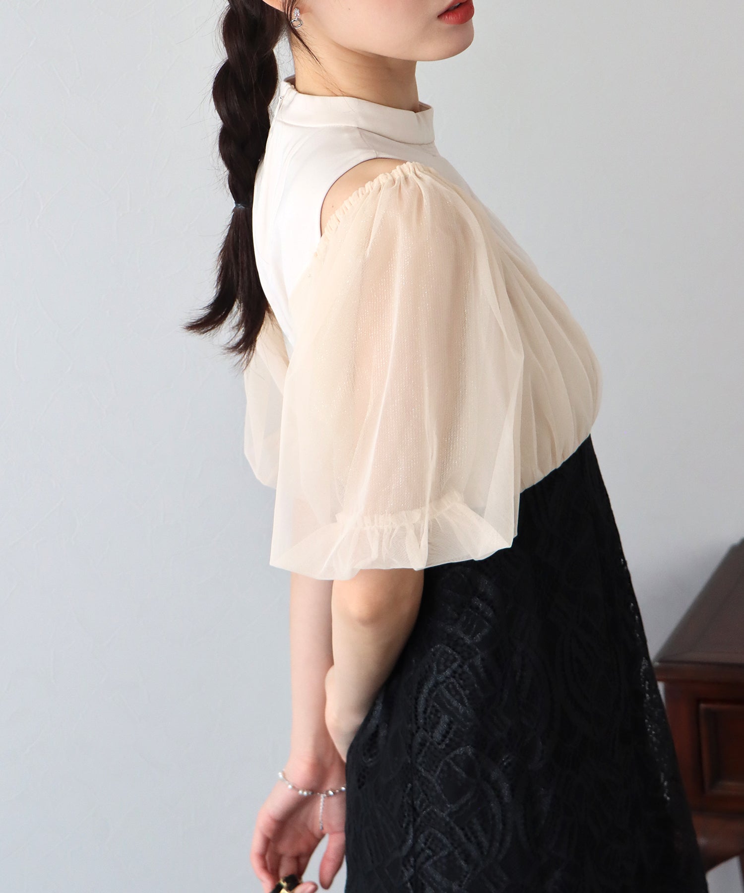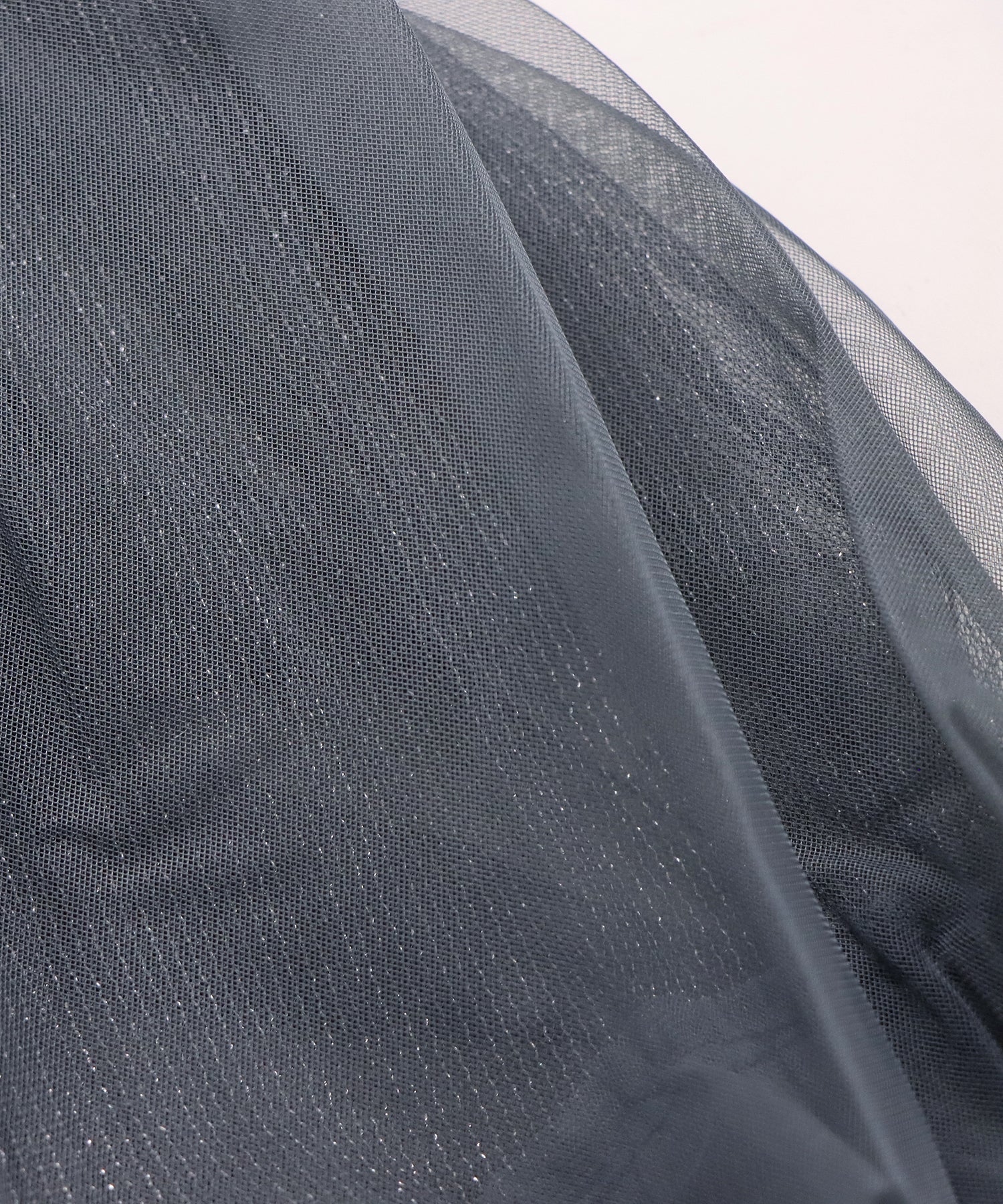 透け感のあるチュールをラメチュールに上品に重ねたパフスリーブで、さりげなく気になる二の腕をカバーしてくれます。