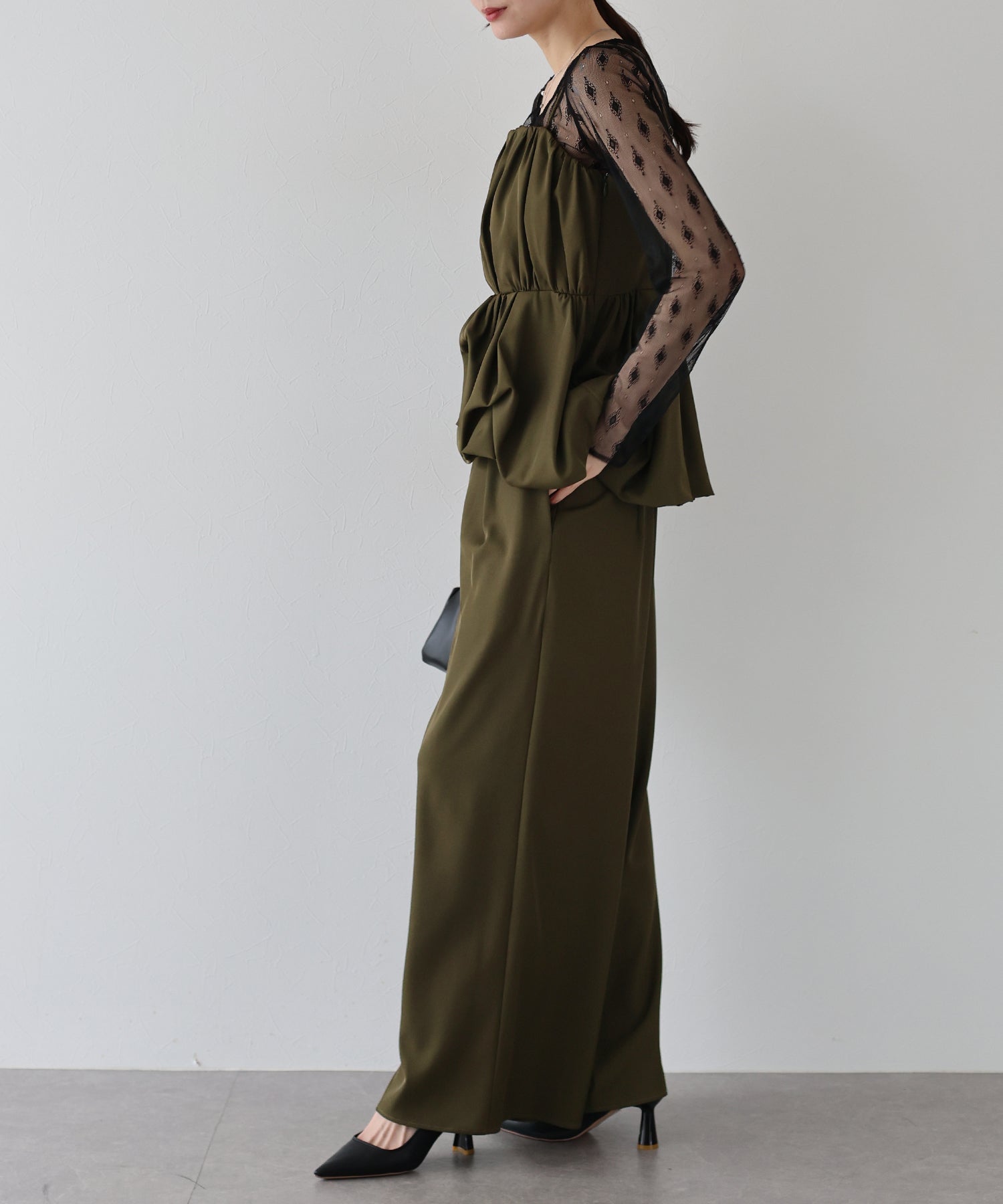 異素材の組み合わせと立体感のあるシルエットが目を惹く、トレンド感たっぷりの3点セットアイテム。