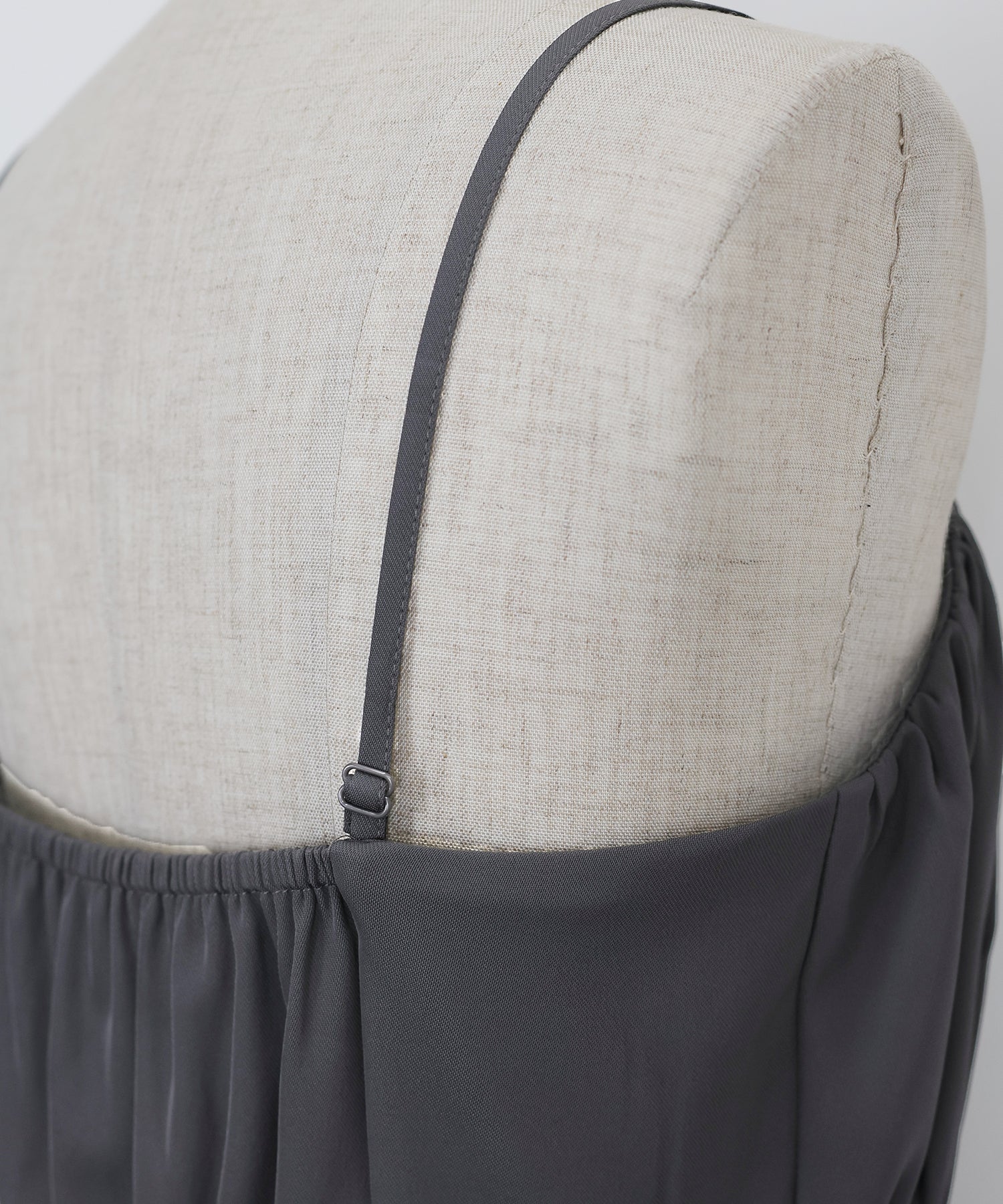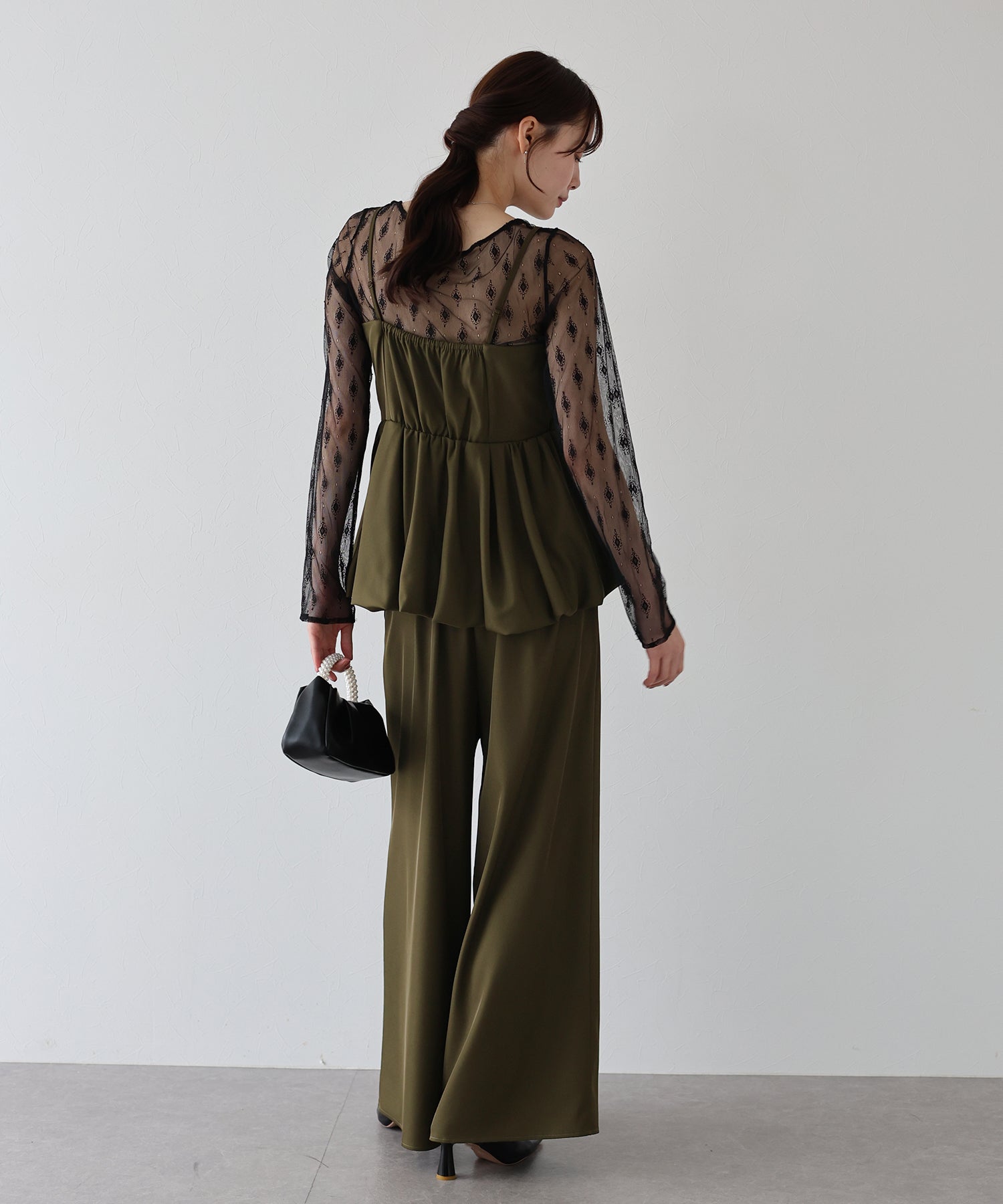 キャミソールは、バルーンシルエットにイレギュラーに入ったランダムタックを施し、空気を含んだようなボリューム感を生み出し、動くたびにふわっと揺れる表情が魅力。