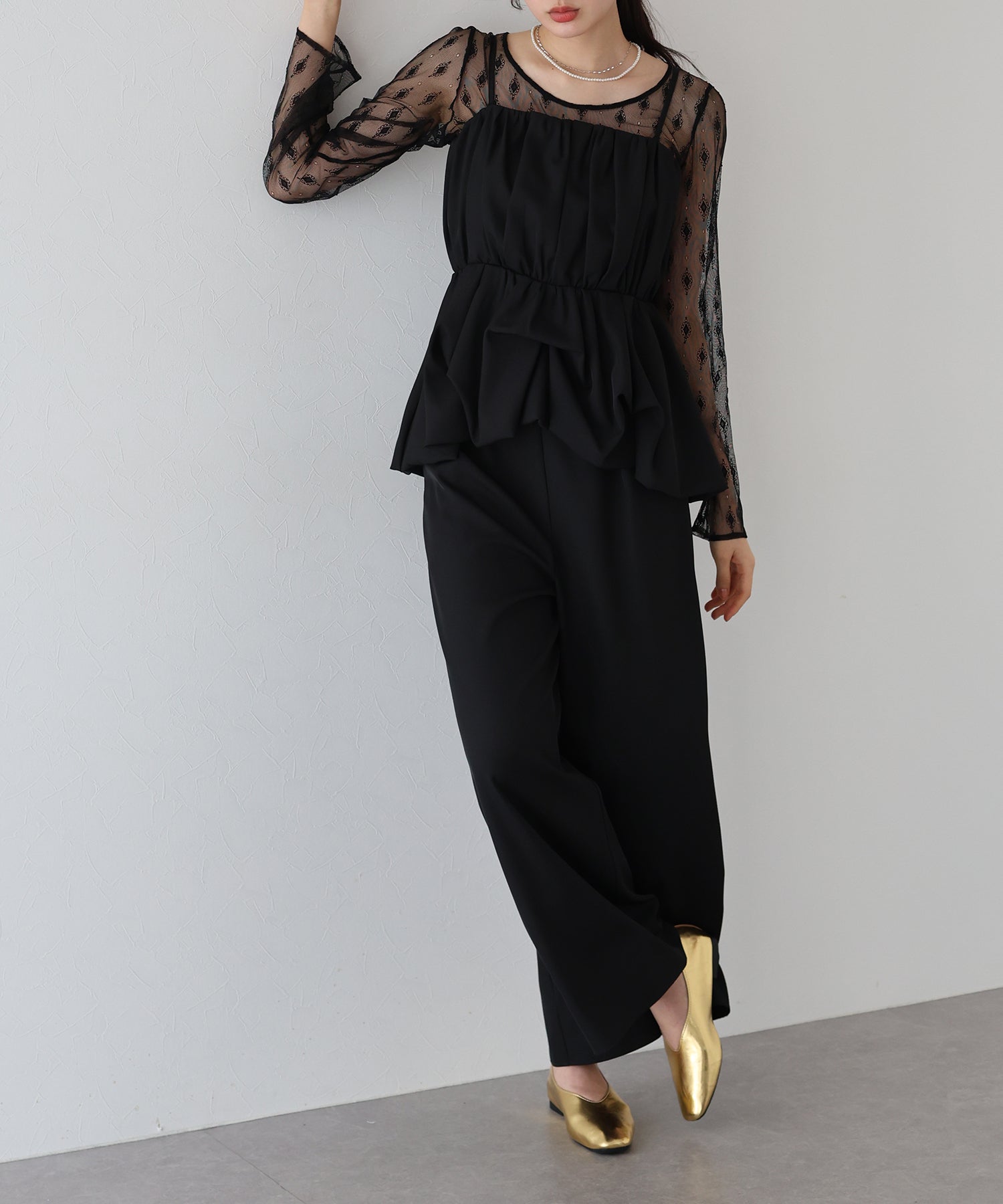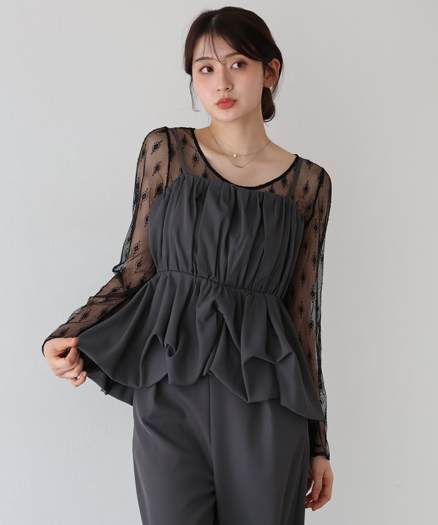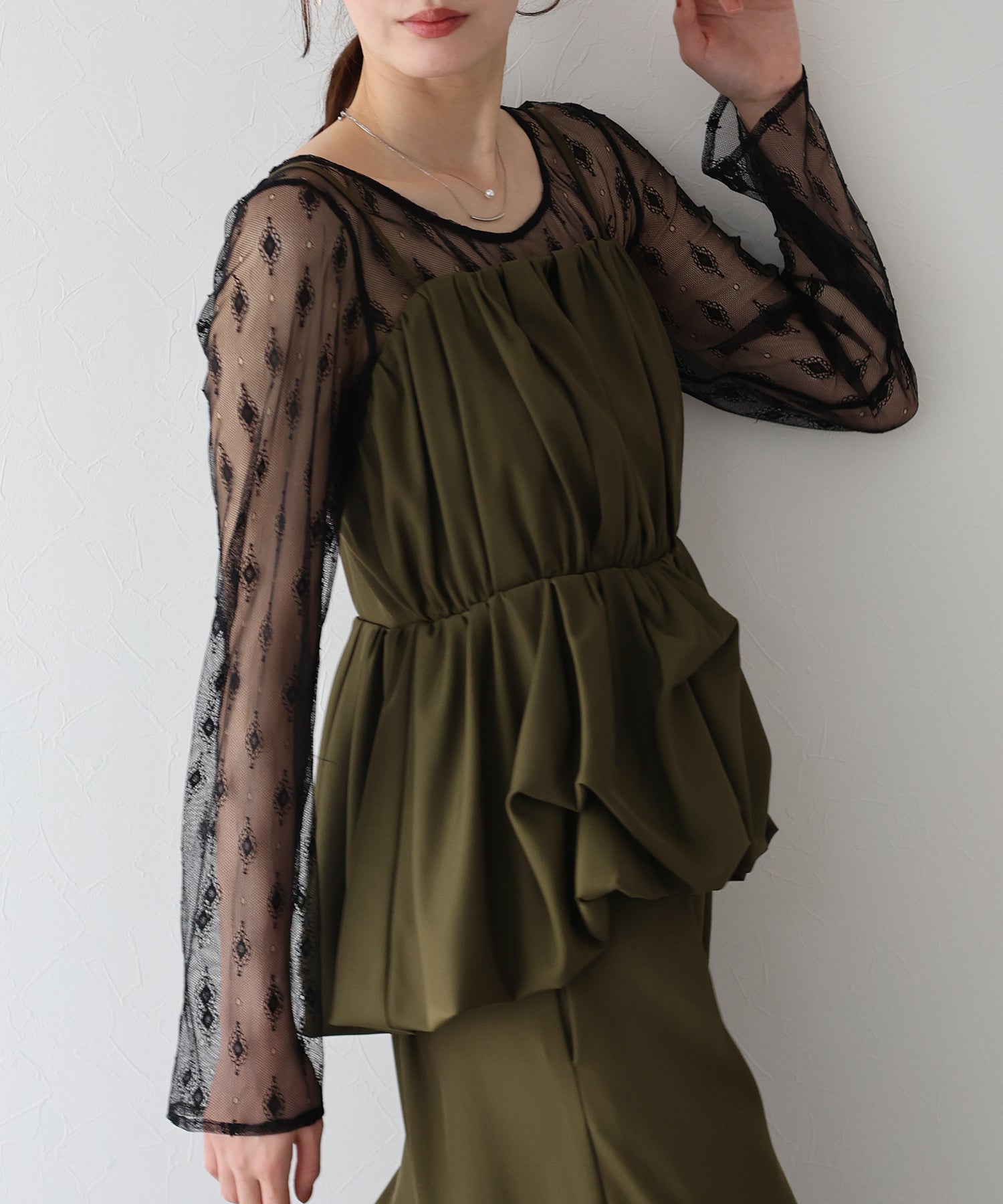 柄入りのシアーレーストップスは、繊細な透け感と上品な印象を兼ね備え、手持ちのアイテムにレイヤードするだけでスタイリングを格上げしてくれます。