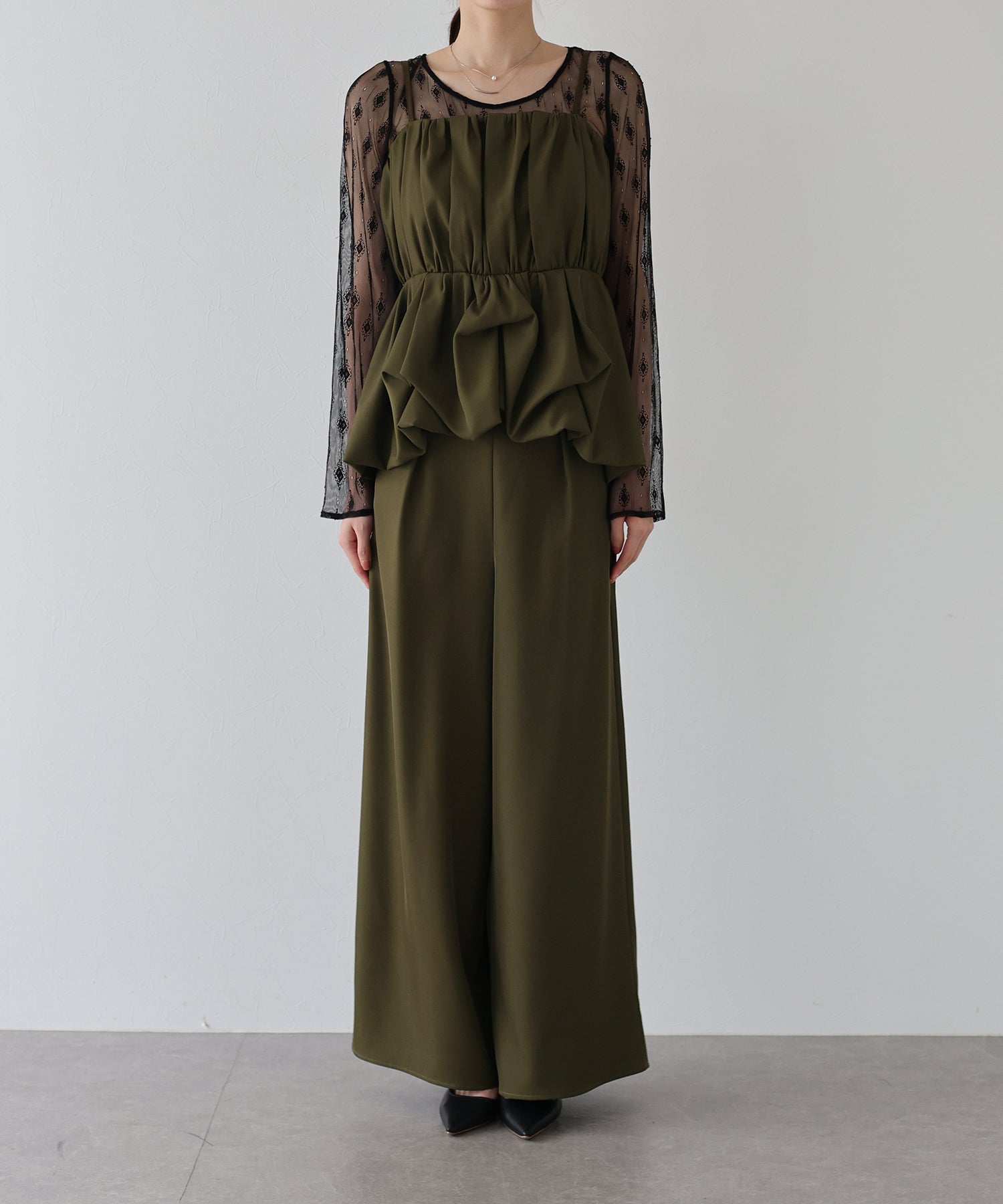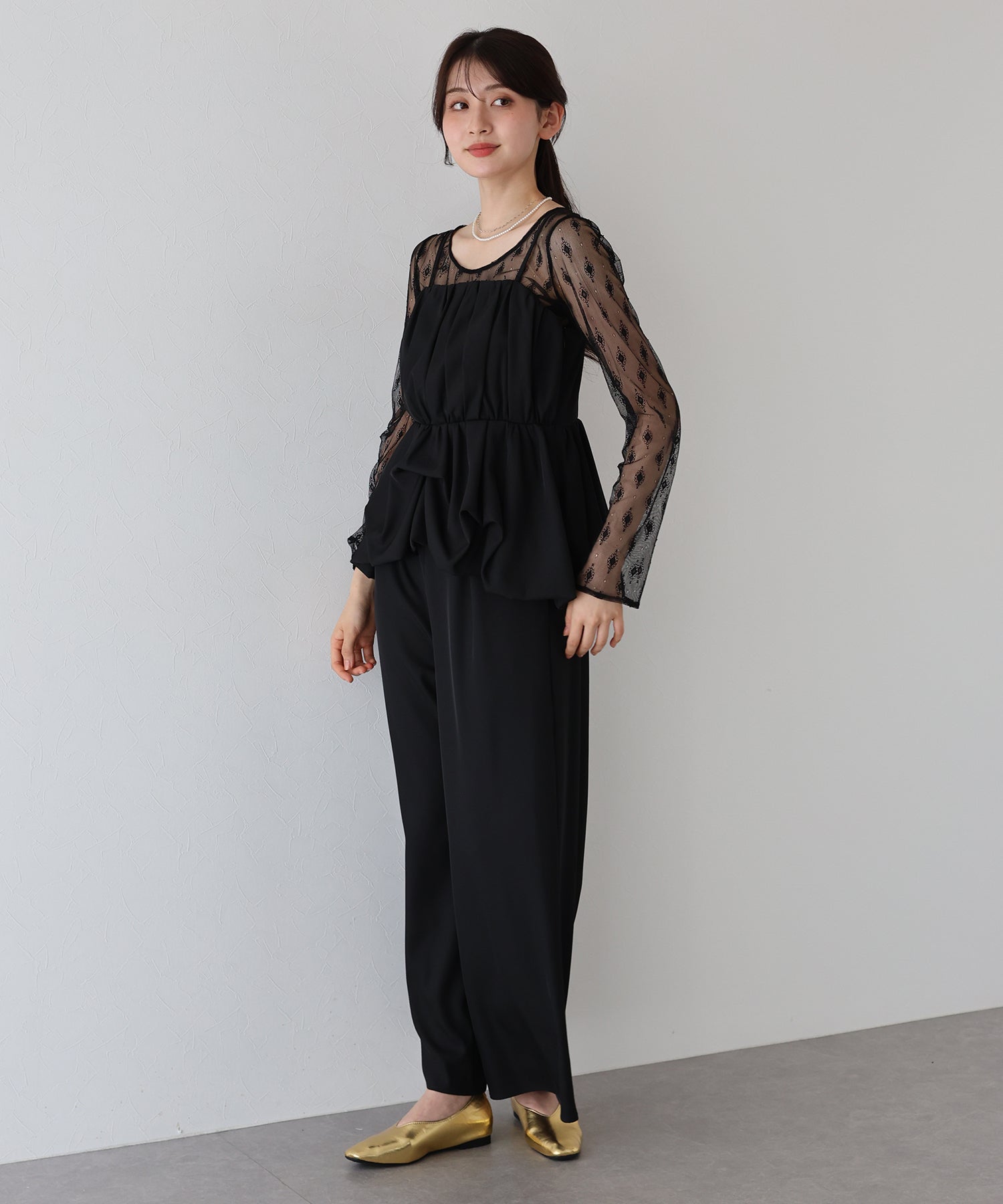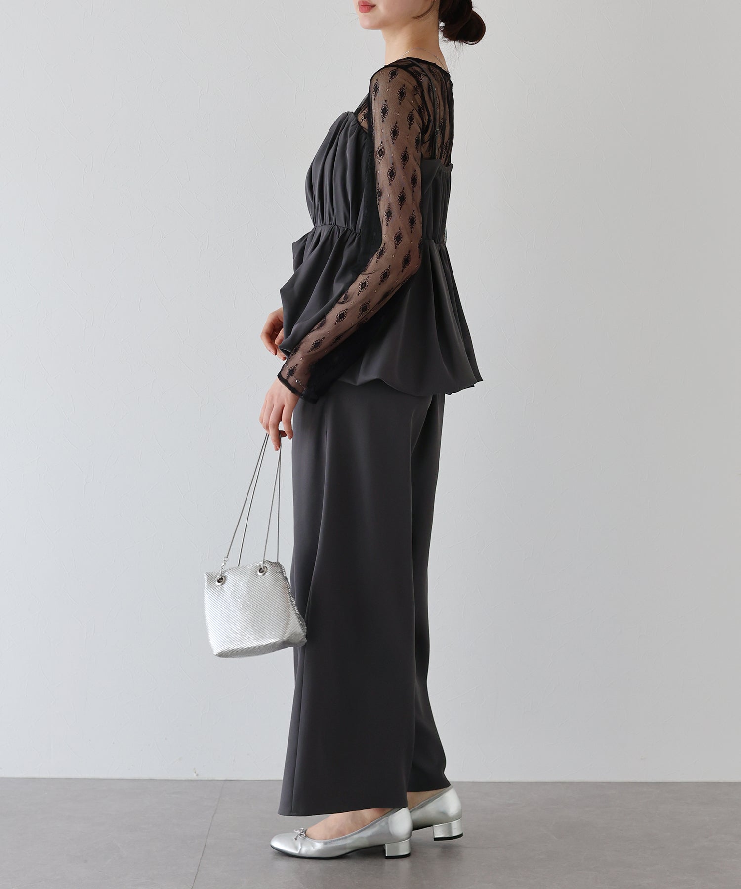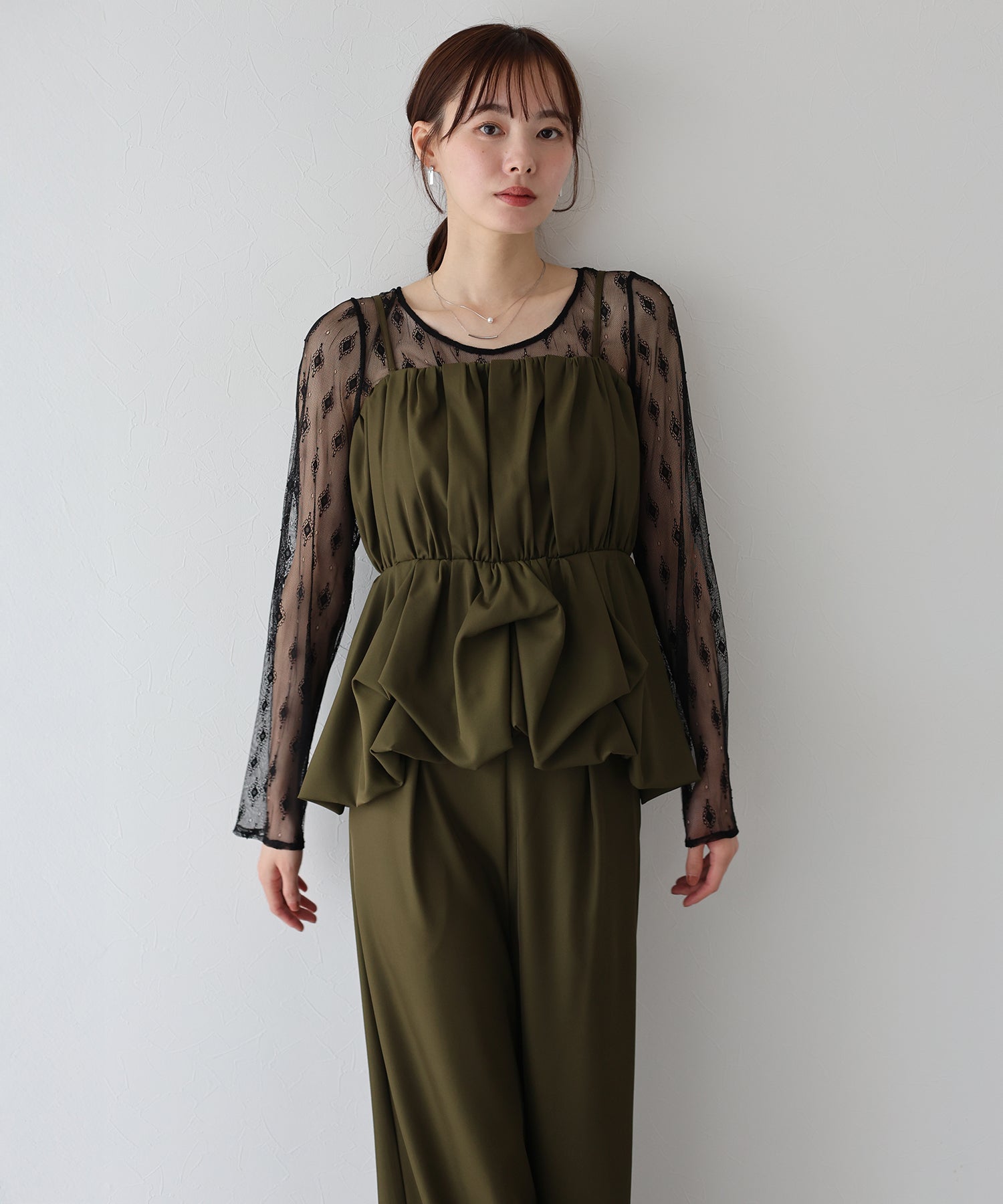 柄入りのシアーレーストップスは、繊細な透け感と上品な印象を兼ね備え、手持ちのアイテムにレイヤードするだけでスタイリングを格上げしてくれます。