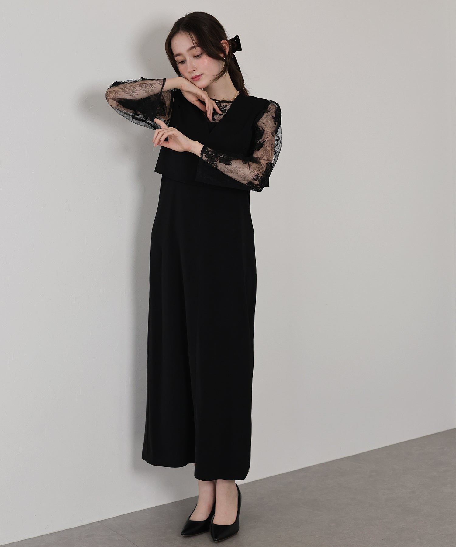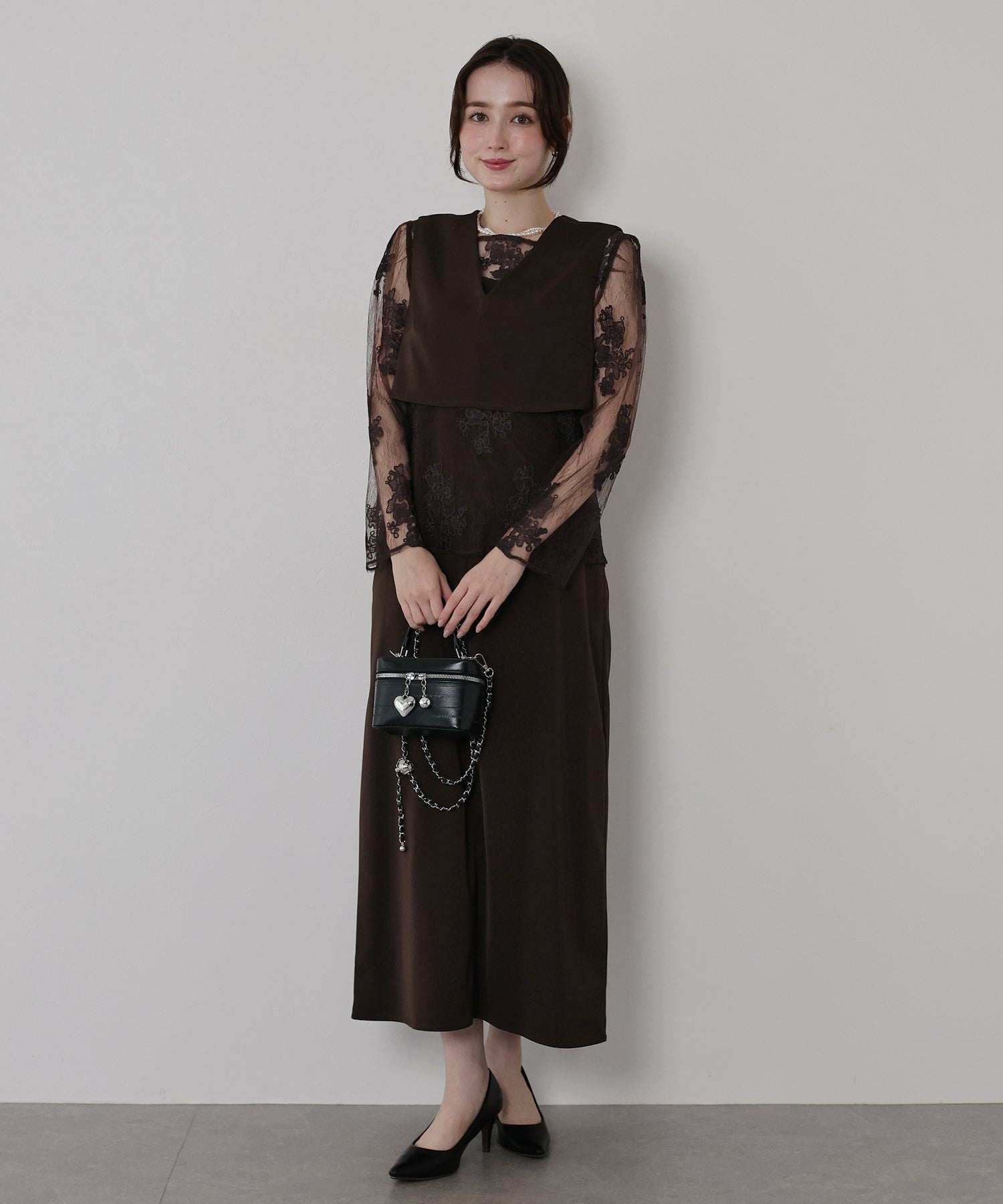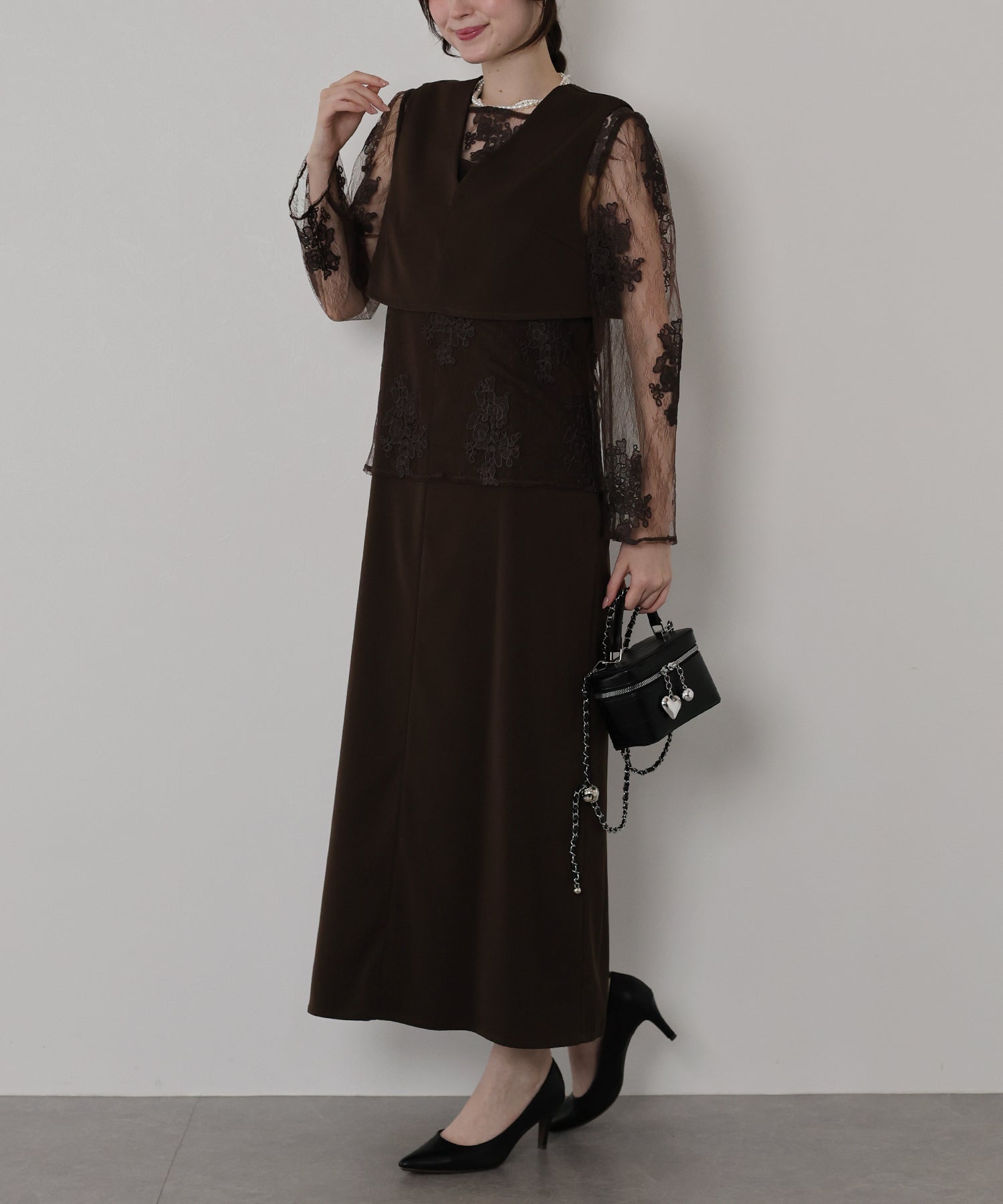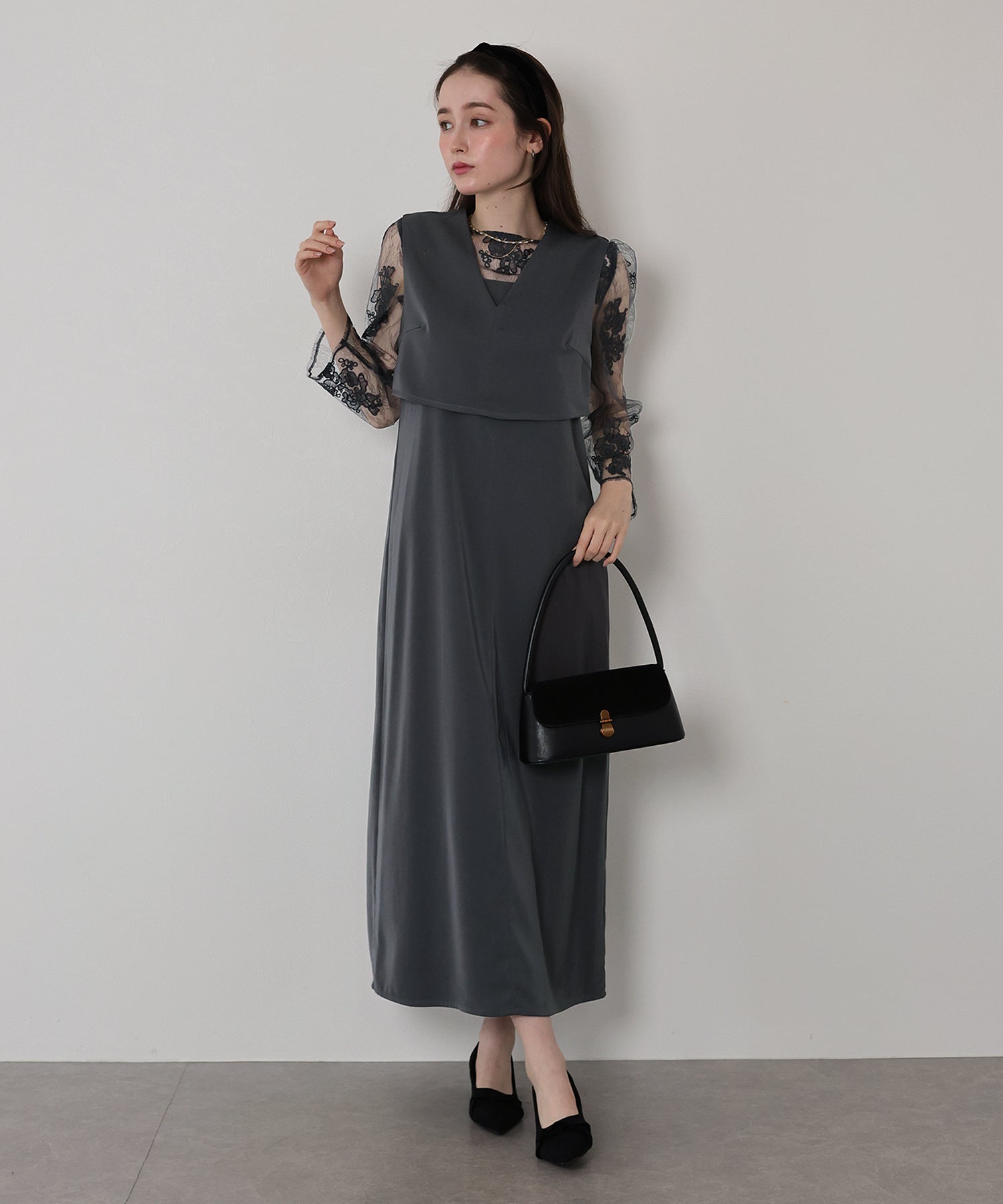 繊細なレーストップスに無地のキャミワンピース、さらに同素材のベストを重ねた3点セットドレス。