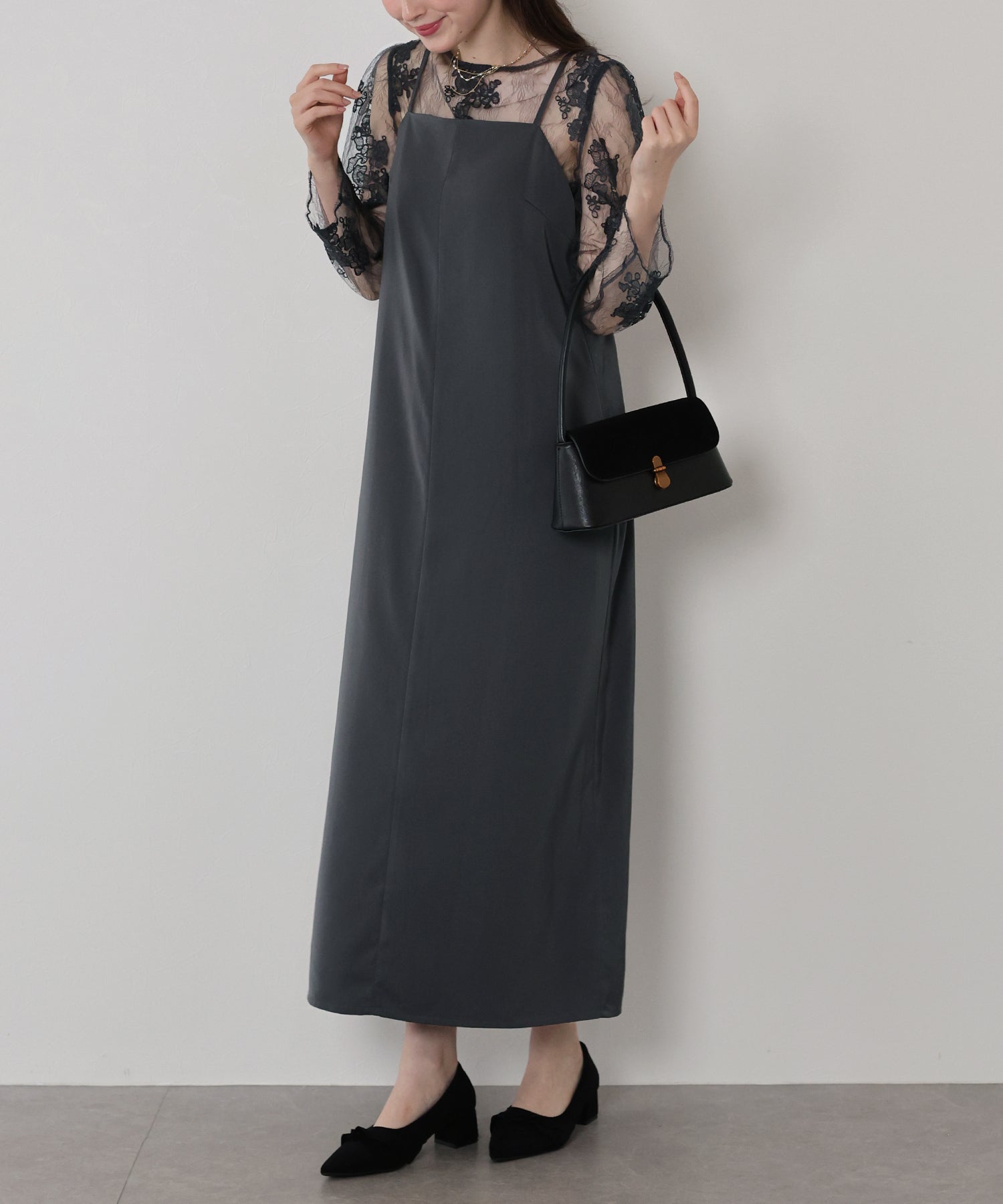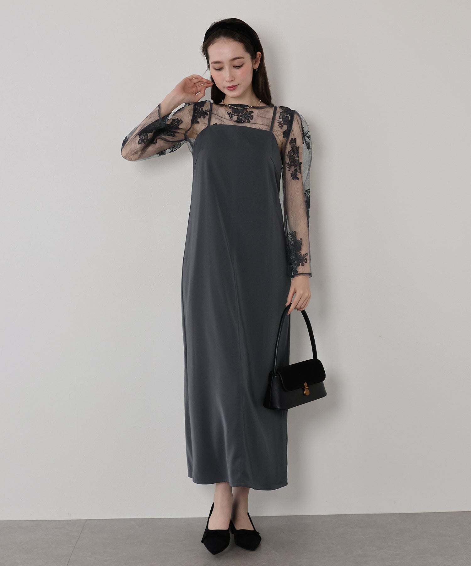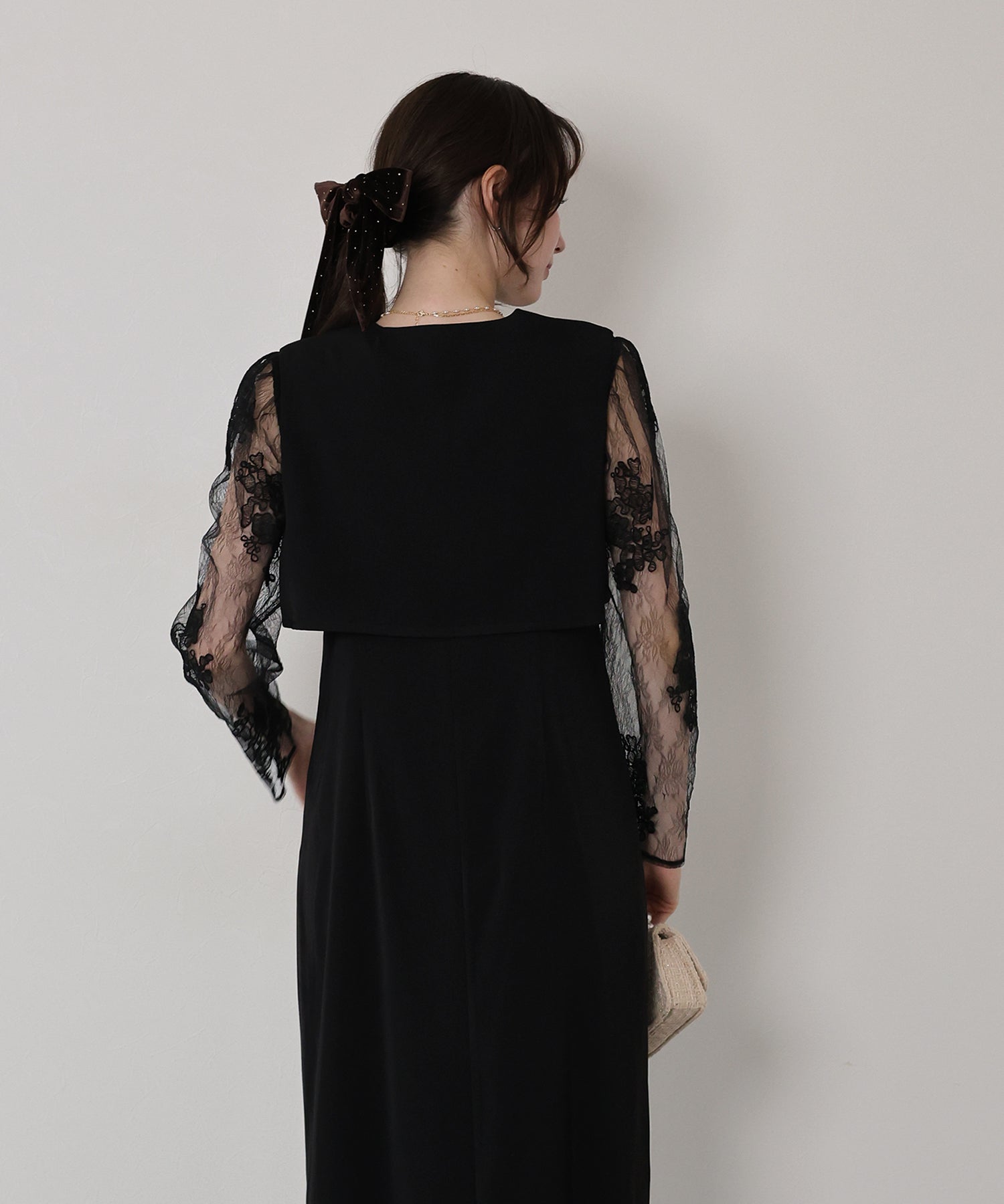 繊細なレーストップスに無地のキャミワンピース、さらに同素材のベストを重ねた3点セットドレス。