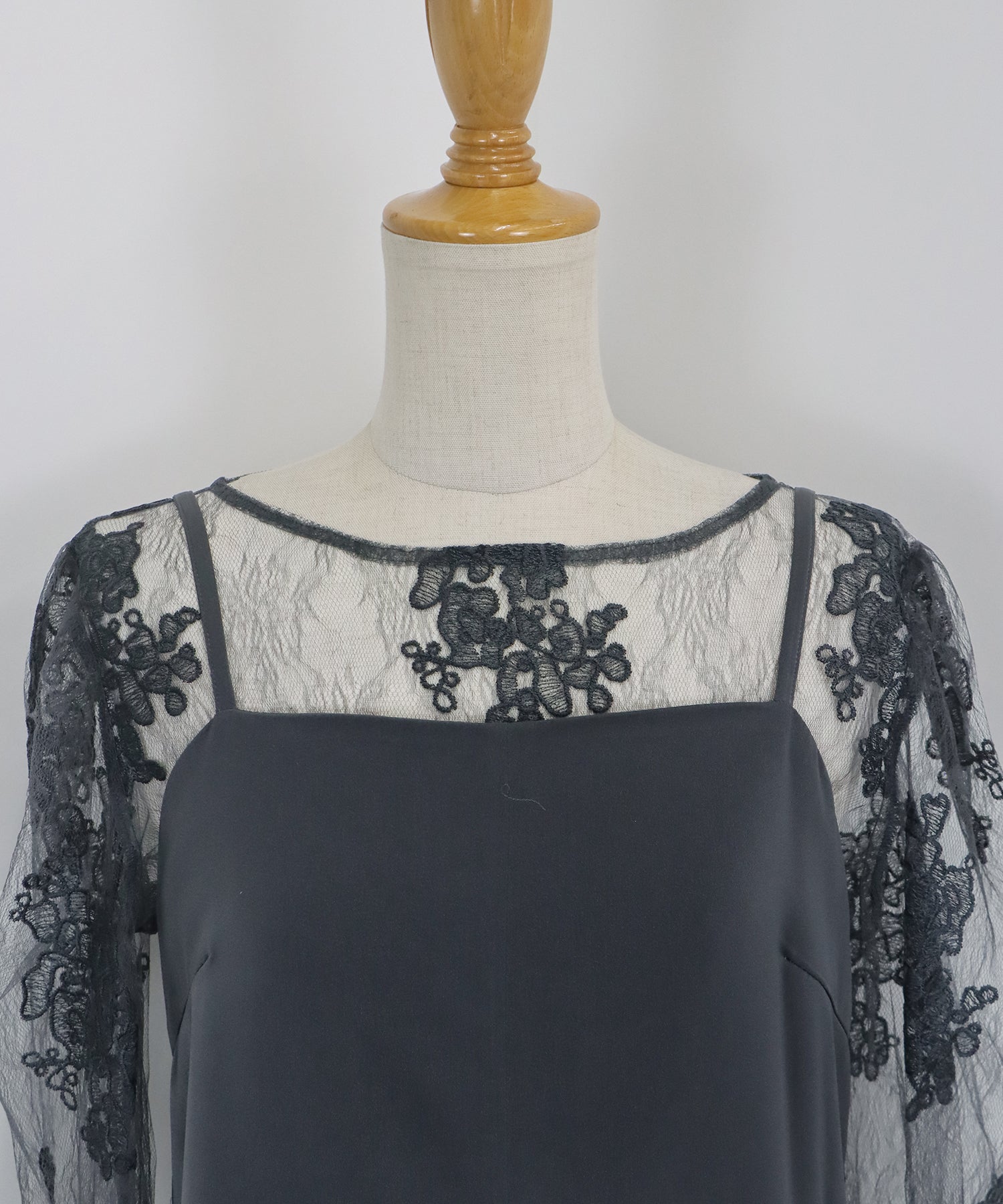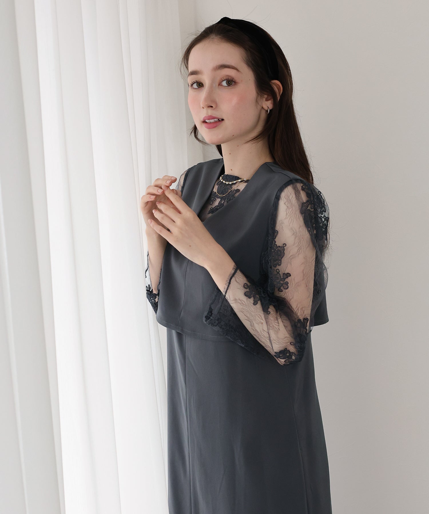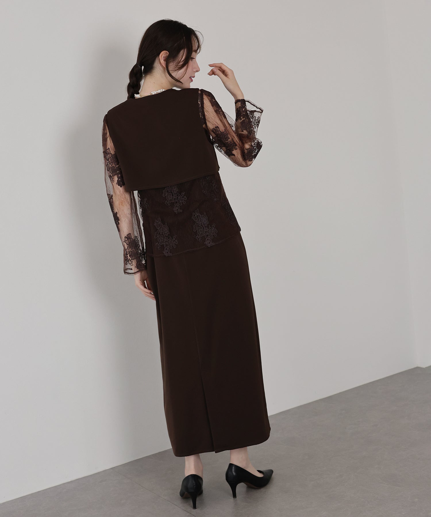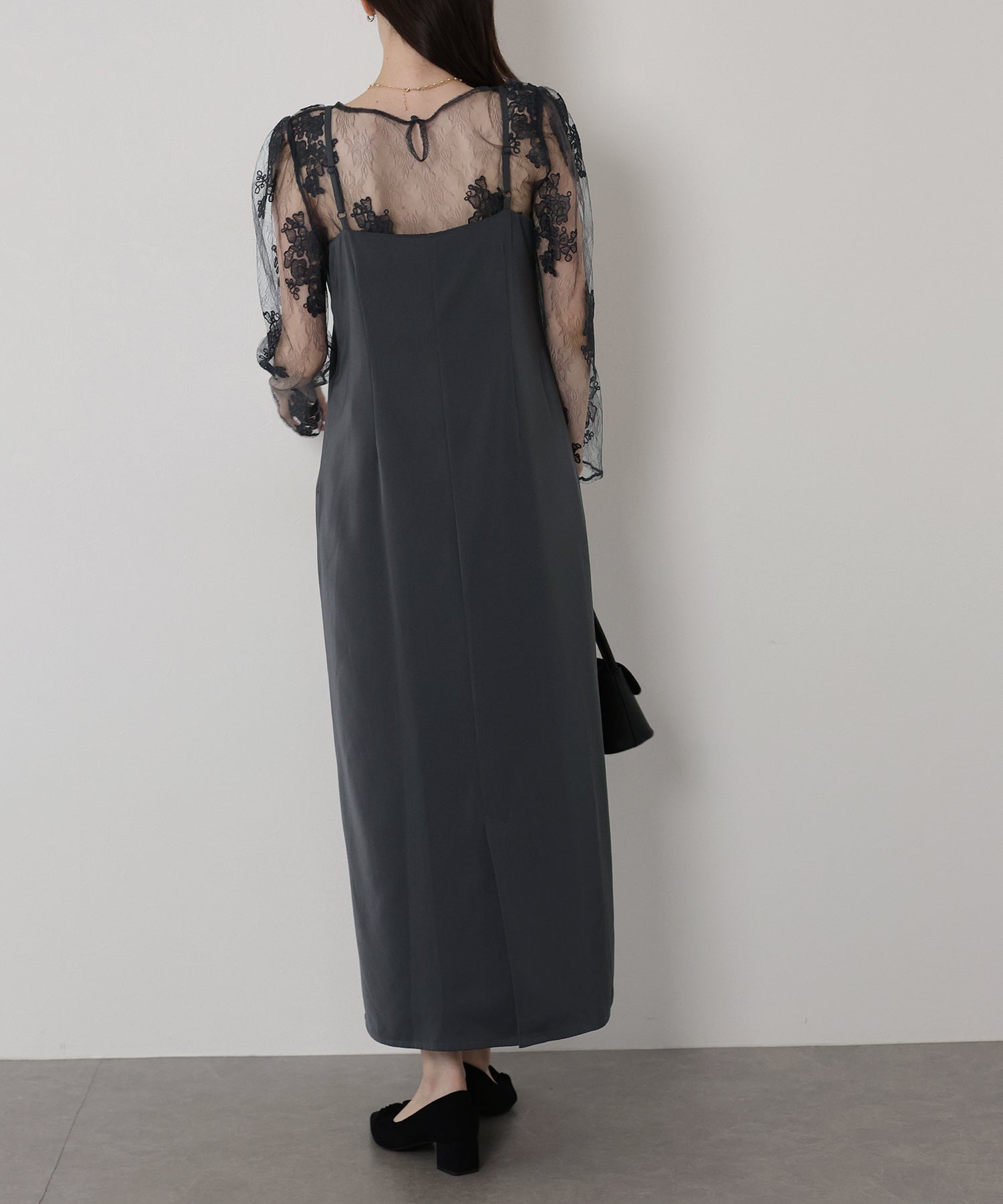 繊細なレーストップスに無地のキャミワンピース、さらに同素材のベストを重ねた3点セットドレス。