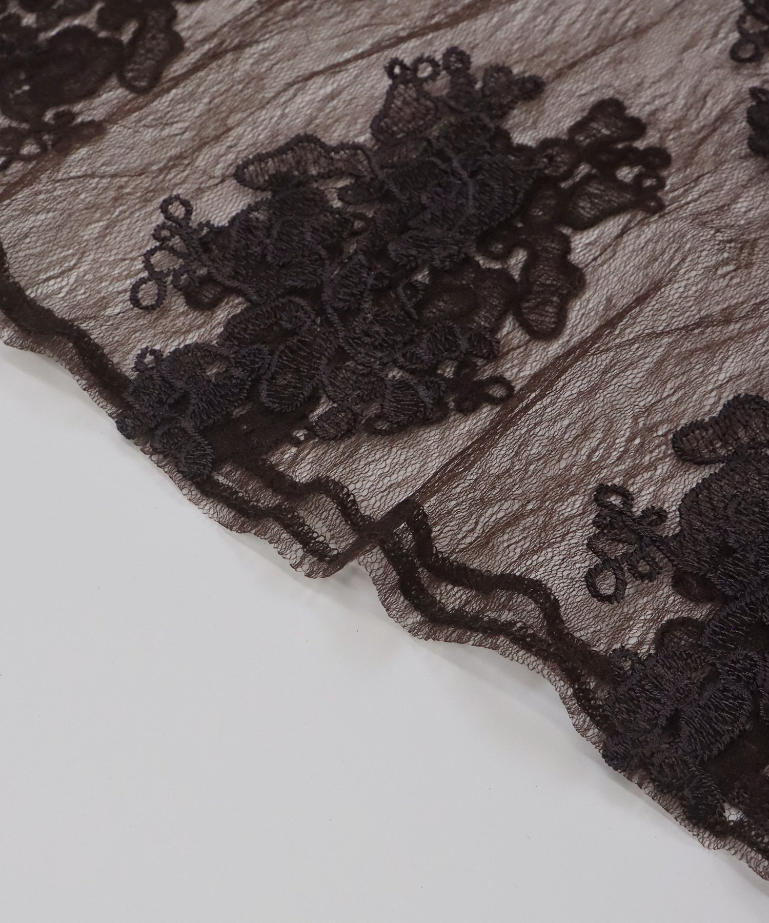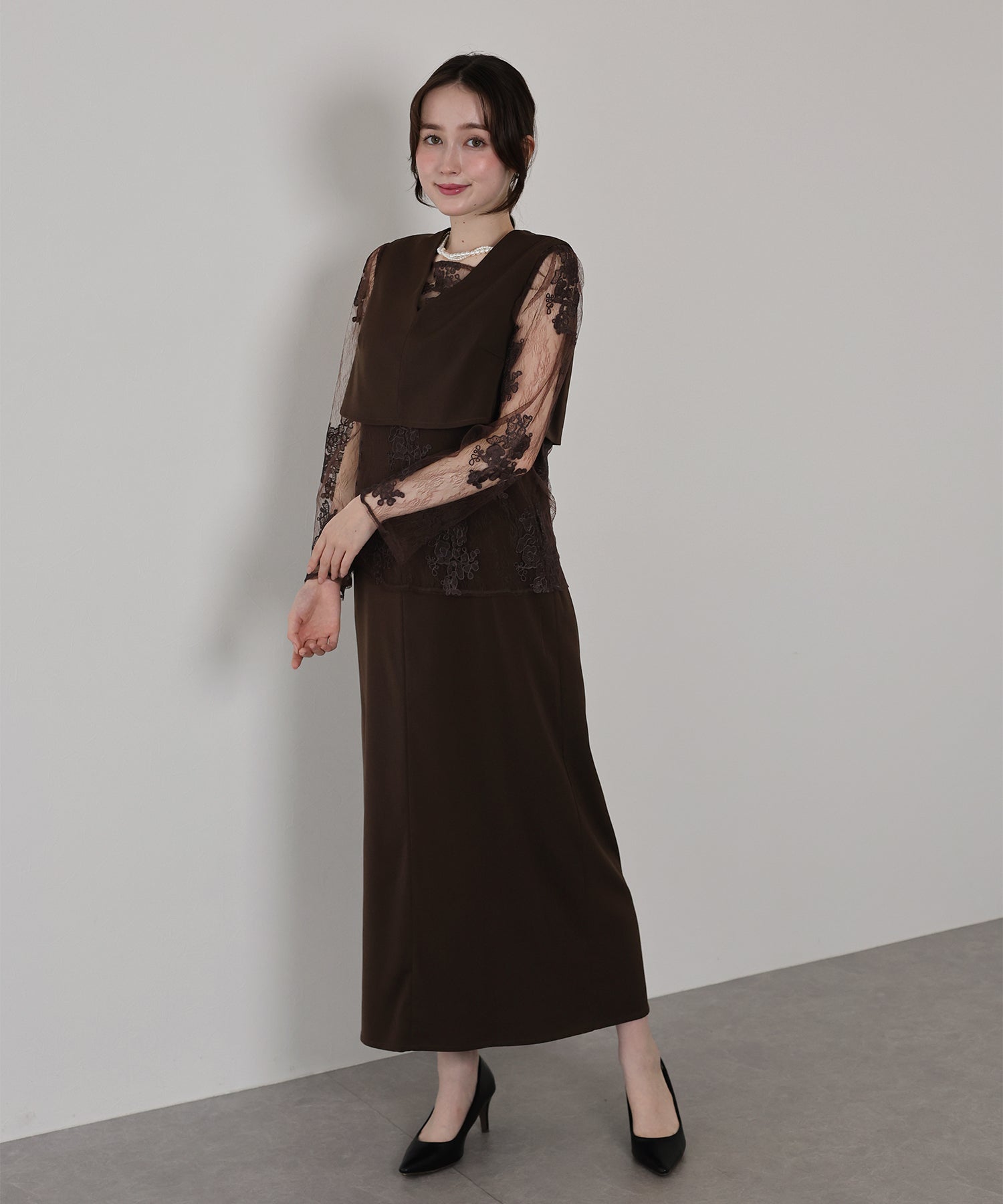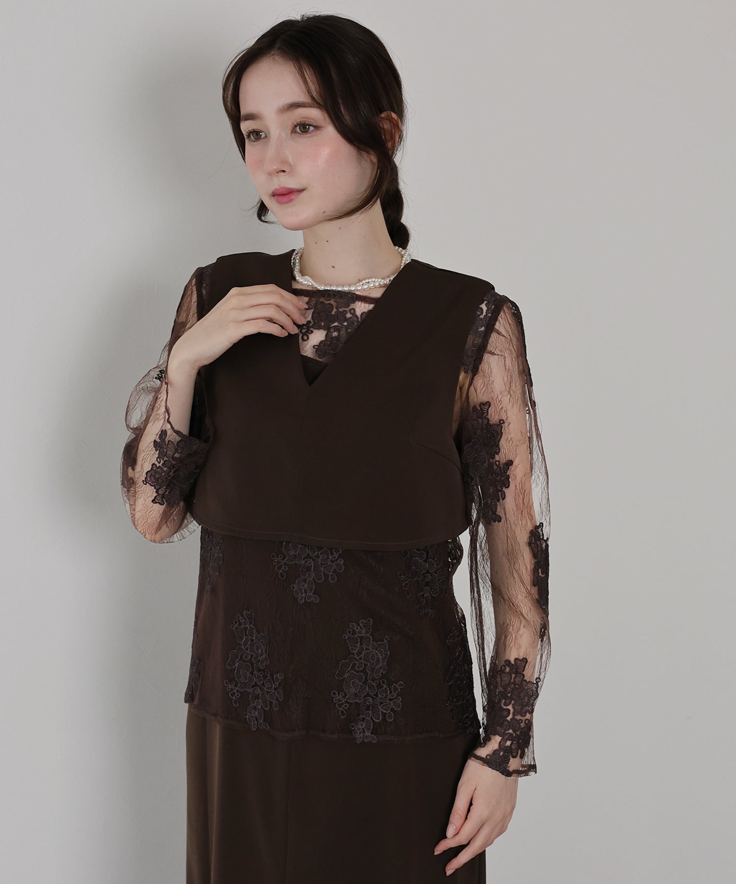 レースの透け感とベストの構築的なデザインが絶妙にマッチし、上品さの中に大人な印象をプラス。
